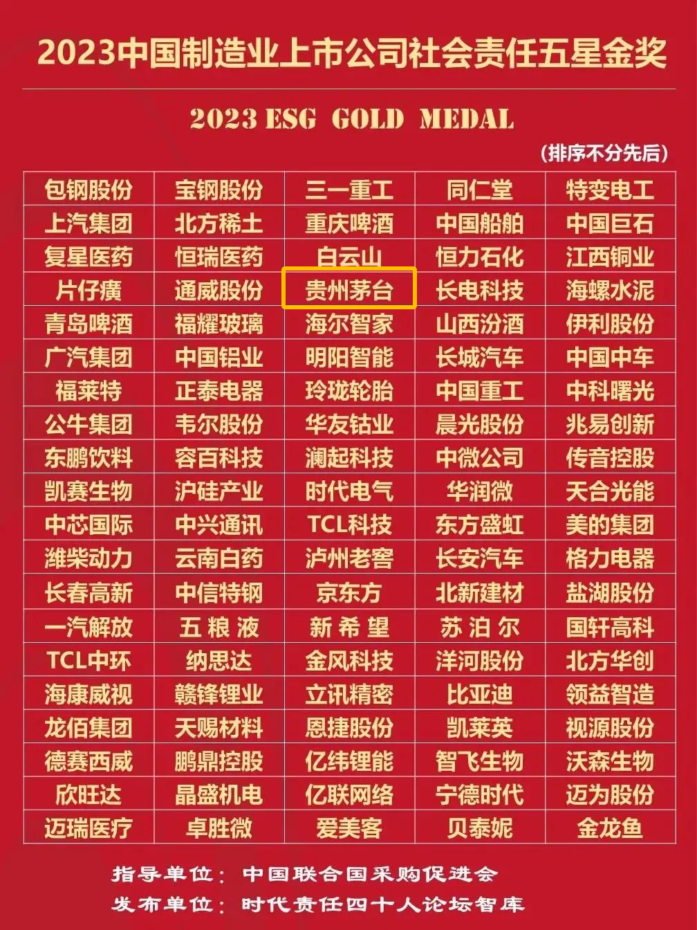 近日,在上海举办的“2023全球可持续发展暨国际公共采购大会”上,在中国联合国采购促进会指导下,时代责任四十人论坛智库正式发布了年度社会责任与ESG大奖《2023中国制造业上市公司社会责任五星金奖榜单(2023 ESG Gold Medal)》,其中,贵州茅台入选。