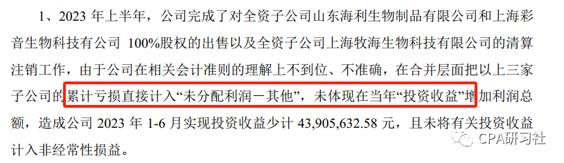 今天来看上市公司海利生物的会计差错更正,我们从专业视角来分析一下差错产生的原因。C社:本案例所述涉及处置全资子公司全部股权。单体层面投资收益是对价直接减去长投账面价值,合并层面投资收益是对价减去权益法调整后的长投,因此,单体与合并层面的差异就在于权益法调整金额。本案例子公司累计亏损,因此权益法调整后的长投较调整前减少,从而合并层面投资收益较单体增加,投资收益从单体金额调整为合并金额的会计处理为:借:未分配利润(以前年度累计亏损),贷:投资收益-处置。根据这笔处理可知,要体现处置投资收益的增加,就得有未分配利润的减少,也就是体现亏损未分配利润,案例所述仅体现累计亏损,未体现投资收益增加的情形,报表应该平不了,还有一种可能,将前述分录的贷方投资收益-处置改成未分配利润-其他,如此报表可平。企业为什么计入未分配利润-其他,理解为可能是认为对应的是以前年度累计亏损。处置子公司丧失控制权处理,准则有明确规定,也是实务中很常见的处理,CPA考试也是常见考点。海利生物未能做正确会计处理,可见其财务专业水准一般,只要是考过CPA会计的,就应该知道正确的处理,所以企业财务需要有CPA人才,或者至少要通过CPA会计。C社:一个上市公司,财务仍然按照开票确认收入,可见财务水准确实太一般,IPO时的大力整改完善,上了市之后全忘了吗。最基本的控制权转移时确认收入还不知道,该公司应该加强对财务人员系统培训准则知识;C社:依据《关于做好执行企业会计准则2008年年报工作的通知》(财会函【2008】60号)的相关规定,“企业接受的捐赠和债务豁免,按照企业会计准则规定符合确认条件的,通常应当确认为当期收益。如果接受控股股东或控股股东的子公司直接或间接的捐赠,从经济实质上判断属于控股股东对对企业的资本性投入,应作为权益性交易,相关利得计入所有者权益(资本公积)”。控股股东的免息资金支持需要根据同期同档贷款利率计提利息费用,同时确认资本公积。此外,根据公告,由于计算口径及相关计算公式链接的错误,导致2020年至2022年年度报告中有关“主要销售客户情况”的数据披露错误:以上差错有涉及专业的,也有涉及基本的统计的,说明该上市公司财务专业水准、工作细致程度都有待提高。有人说过,IPO时期是一个公司最规范、财务水平最高的时候,确实不假。10月入会优惠!