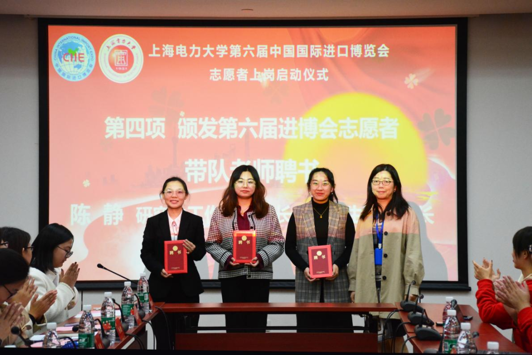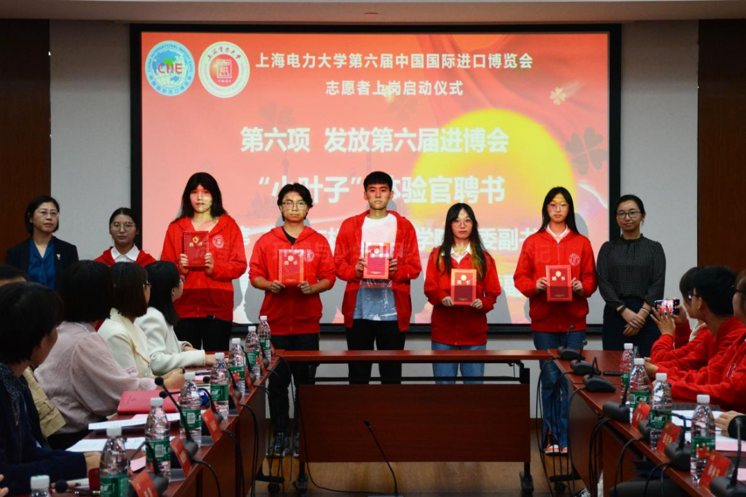 在志愿者队伍里面,有这么一群人,他们用镜头记录进博,用年轻人的视角讲述中国故事。他们就是我们的“小叶子”体验官们。由能源与机械工程学院党委副书记周婷和环境与化学工程学院党委副书记涂莹亮为“小叶子”体验官们颁发聘书。