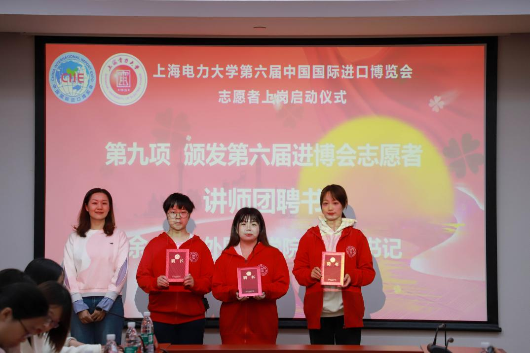 我校今年将组建小叶子讲师团传承工作经验和志愿精神,他们将会是小叶子们最亲密的引领者。由外国语学院党委副书记余嘉为进博会志愿者讲师团颁发聘书。