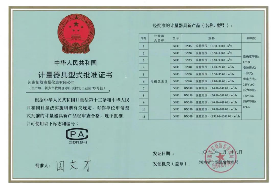 河南新航仪表XFE系列0.2级电磁流量计计量器具形式批准证书