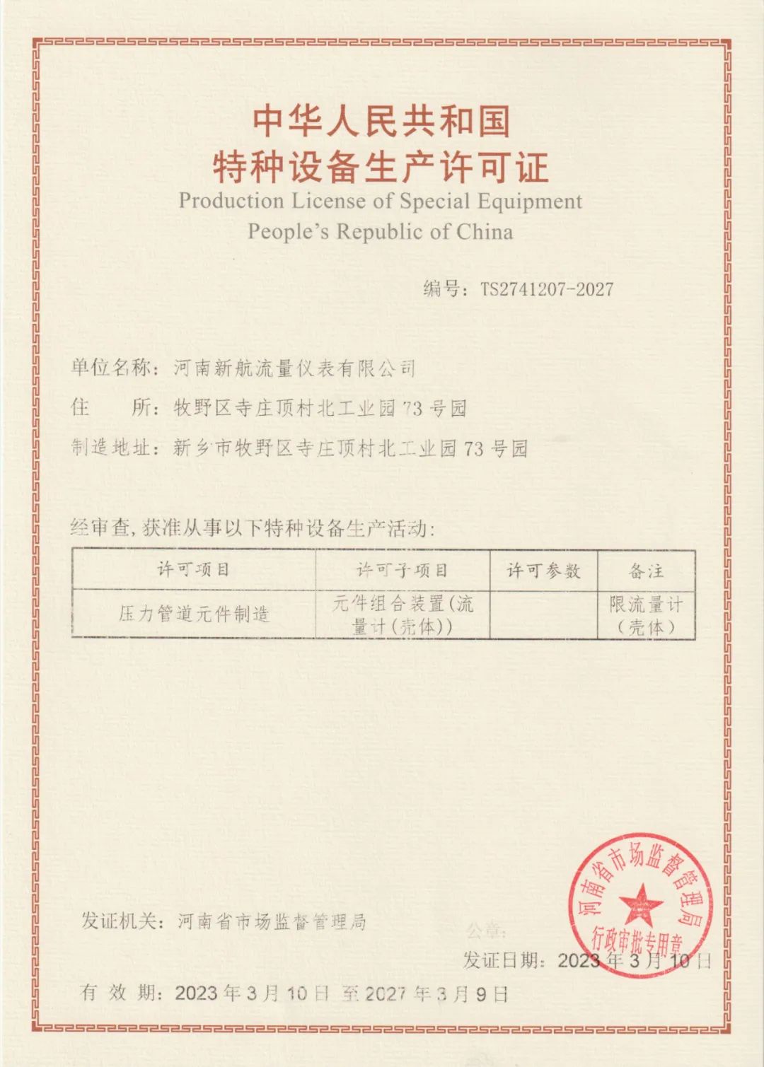 河南新航仪表有限公司流量计(壳体)特种设备生产许可证