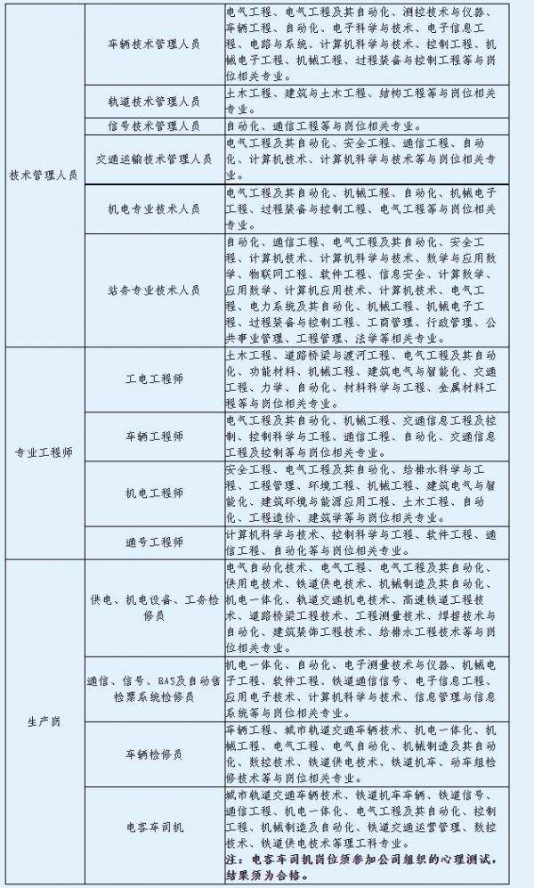 沈阳地铁集团有限公司运营分公司(以下简称“运营分公司”)成立于2010年4月21日,隶属于沈阳地铁集团有限公司,系市政府直属国有独资企业分支机构,承担着沈阳地铁各条线路的运营、管理工作。目前,运营分公司已运营线路5条,分别为1、2、4、9、10号线,运营里程165公里,共设车站122座(含换乘站11座)、车辆段/停车场8座,控制中心2座;在建线路3条,分别为1号线东延线、3号线、6号线。 在既有线路平稳运营、新线陆续兴建的今天,我们诚邀您的加入,共同开创未来事业。 本次提供三类招聘岗位,分别为:技术管理人员、专业工程师、生产岗。 招聘地铁车辆、轨道、信号、交通运输、机电、站务等专业方向的技术管理人员。 拥护中国共产党的领导,遵守国家的法律、法规和企业各项规章制度,具有良好的思想政治素质和职业道德,遵纪守法,无酗酒、赌博等不良嗜好,生活作风良好,无任何违法犯罪记录。 招聘对象为18周岁以上、30周岁以下(1992年10月至2005年10月期间出生),全日制本科及以上毕业生。 招聘对象为18周岁以上、30周岁以下(1992年10月至2005年10月期间出生),全日制本科及以上毕业生。 检修员岗位招聘对象为2022、2023届全日制大专及以上毕业生;电客车司机岗位招聘对象为2022、2023、2024届全日制大专及以上毕业生。 成绩优异,取得学历、学位证书并通过国家大学英语四级。 身高1.65-1.90米,矫正视力在1.0以上,听力、嗅觉正常,无影响列车驾驶安全的各类疾病,普通话标准流利,语言表达能力良好,安全意识强,服务意识好,心理素质过硬,富有工作责任心,思维敏捷,反应迅速,能够承担工作压力,能够适应倒班工作,具有电客车驾驶经验者优先。 电客车司机岗位须参加公司组织的心理测试,结果须为合格。 采取网络报名方式,招聘流程分为报名、面试、录用三部分。 登录地铁集团官方网站,点击“沈阳地铁集团有限公司诚聘”(https://wxapi3.symtc.com:8090/recruit/index)进行报名,或点击“人才工作”板块进入报名页面,按提示填写个人信息并提交。报名信息填写前请认真阅读“应聘须知”,报名信息提交后,点击下方“导出报名表”按钮,下载个人《报名登记表》。每名应聘人员仅限报名一个岗位。 应聘人员在面试当日持《报名登记表》纸质版(附照片,最下方须本人签字确认)进行面试。 2023年10月27日起至2023年11月9日截止。 根据报名人员所提交的材料,对报名者进行资格审查、甄选、确定面试人选。 公司将以短信方式通知符合条件人员参加面试,报名人员也可通过地铁集团官方网站进行结果查询。面试主要考察应聘人员对基本专业知识的掌握及自身的综合素质。电客车司机岗位人员面试前须确保本人身高符合报名条件。 公司将组织面试初试合格人员开展集中体检及身份核查等工作,具体工作安排公司将以短信方式通知,符合录用条件的人员将予以录用。
