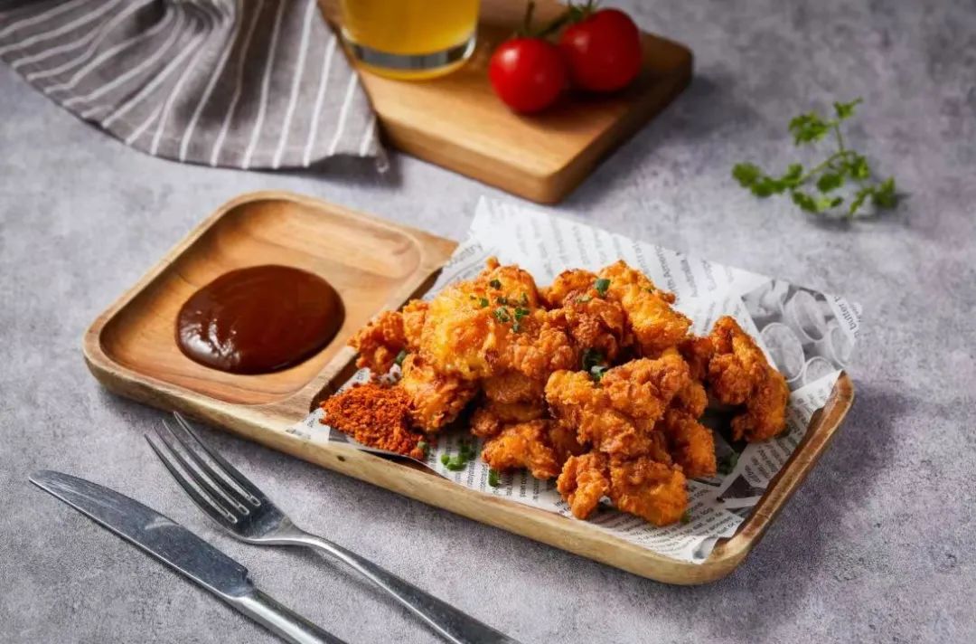 小目标炸鸡:原麦汁啤酒配上纯牛奶腌制的鸡肉,炸至外酥里嫩,配上自制云南酸汤炸鸡酱,入口偏酸辣,不蘸酱也很好吃。