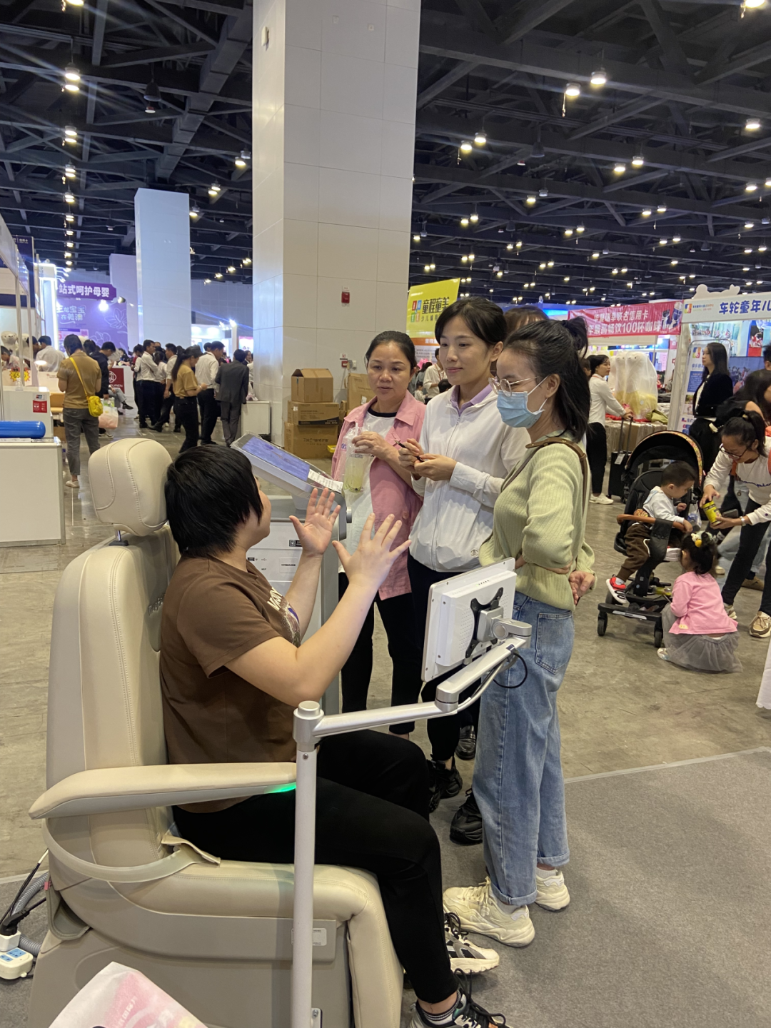 展区现场准备了分娩阵痛体验仪,用一次“超逼真”的疼痛体验给准爸爸们创造一次“分娩过程疼痛”的感受。准爸爸们积极参与,排队等待体验。体验后的准爸爸们纷纷表示感受到了妻子的不易和付出,十分佩服与感谢自己的妻子!