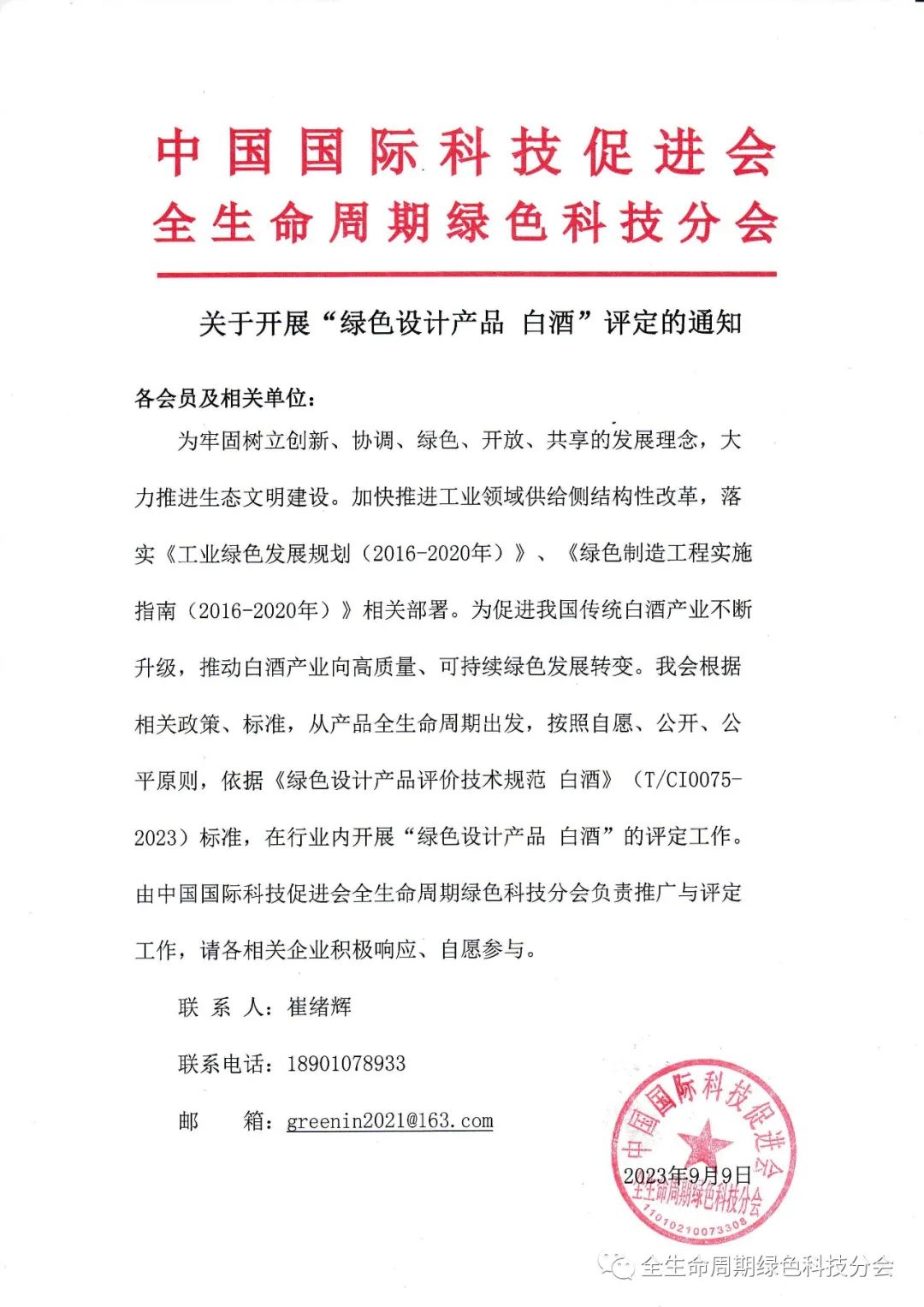 关于开展“绿色设计产品 白酒”行业评定的通知