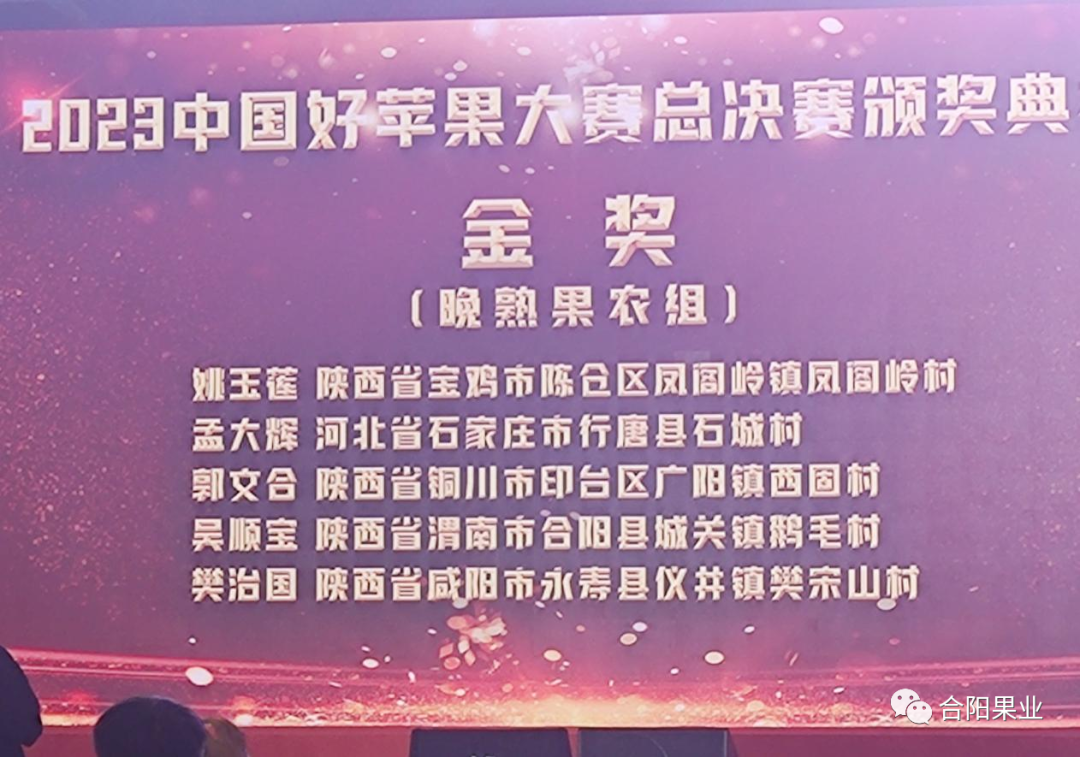 在2023中国好苹果大赛总决赛中,经过激烈角逐,合阳县坤农果蔬种植专业合作社、城关镇鹅毛村吴顺宝、甘井镇休里村孙晓峰所产苹果荣获大赛总决赛“2金2银”;合阳县坤农果蔬种植专业合作社、巴克艾有机水果家庭农场、金峪镇股份经济联合社、兴皇苹果专业合作社荣获十佳明星果园;合阳县果业发展中心荣获大赛最佳组织奖。