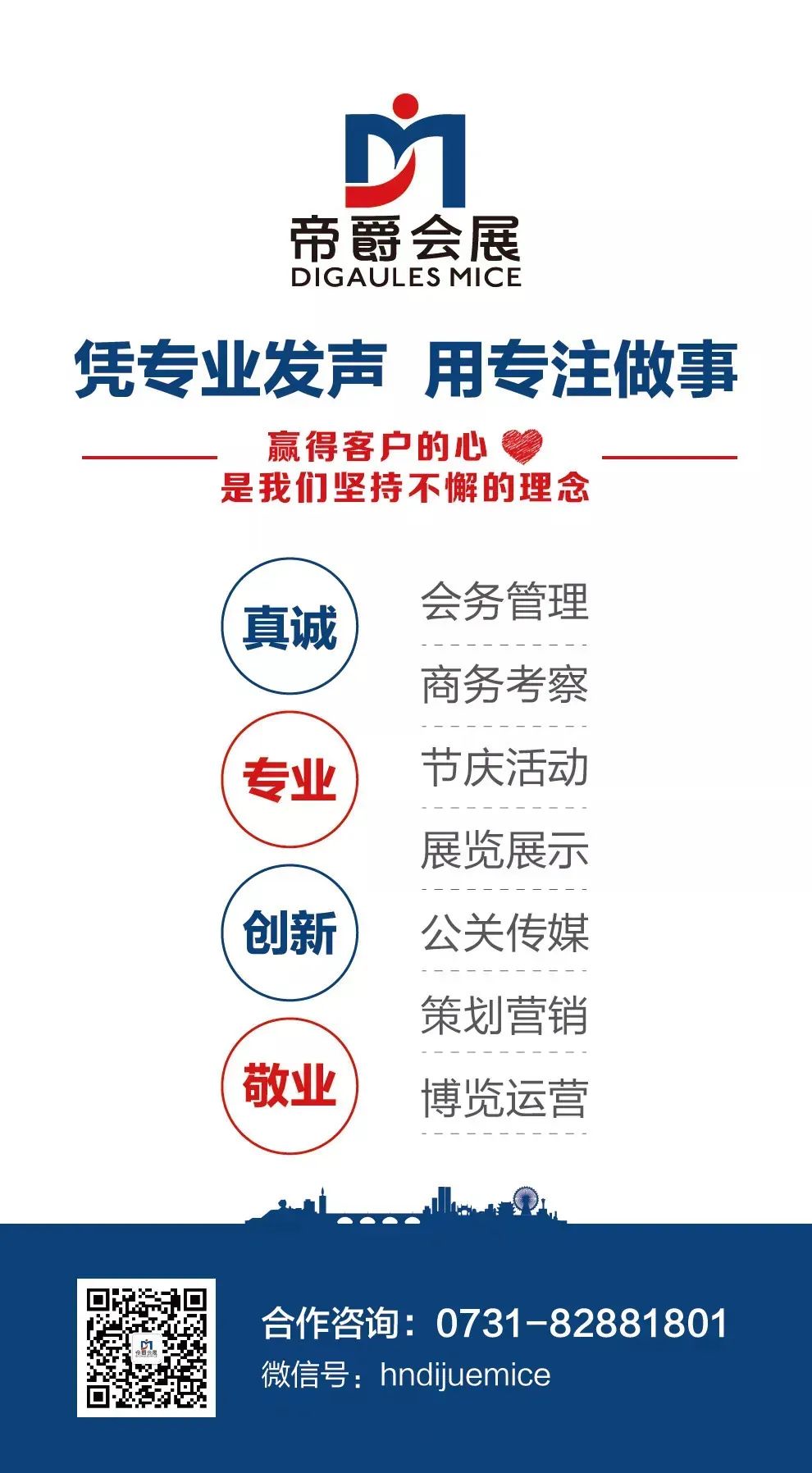 帝爵会展创业6年来,帝爵人不忘坚守初心,始终追求服务品质,在行业中稳扎稳打且硕果累累,不仅连续三届为湖南最大展会长沙国际工程机械展提供专业服务,同时服务于中国国际食品餐饮博览会、国际通用航空展业博览会、中非经贸博览会等大型展会,还先后成功自主引进第二十次全国电化学大会、中国产业区块链峰会、中国医院院长年会,国际铅锌大会,服务对象已涵盖政府、医学、院校、金融等多个领域。