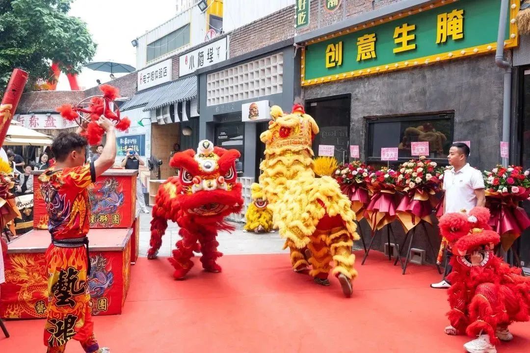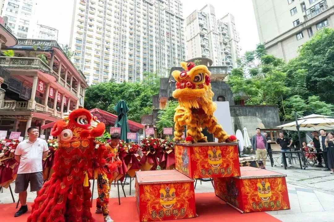在主持人宣布仪式正式开始之后,两只威风凛凛的雄狮在锣鼓喧天中,飞身而出,闪躲腾挪,动作行云流水。