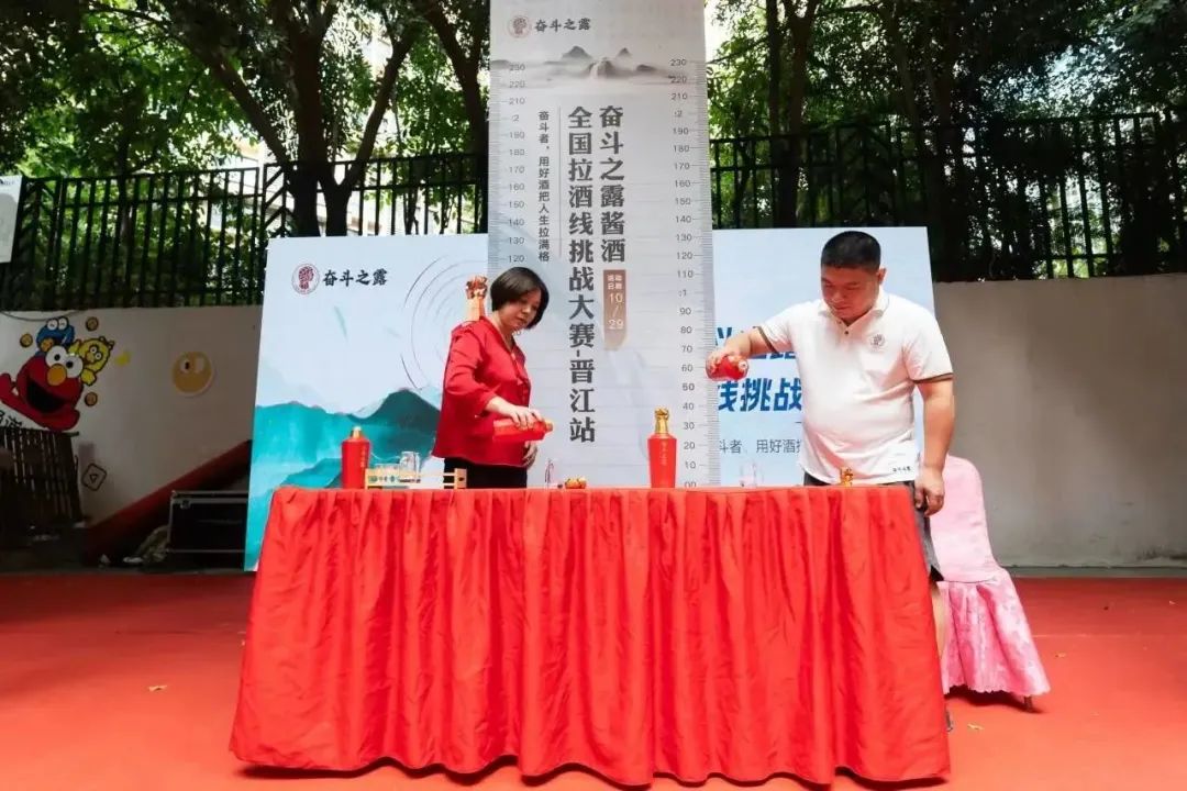 奋斗之露全国花式拉酒线之晋江现场挑战赛正式开启,点燃了现场所有人的激情。首先,福建省区团队王娜和融辉奋斗之露深圳体验店总经理柳俊先生带来了精彩的拉酒线表演!随后,挑战者纷纷上台,展现拉酒线的魅力,一波又一波的PK,更是将现场的气氛推向顶点。
