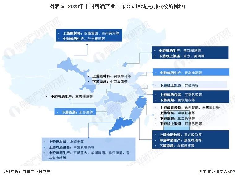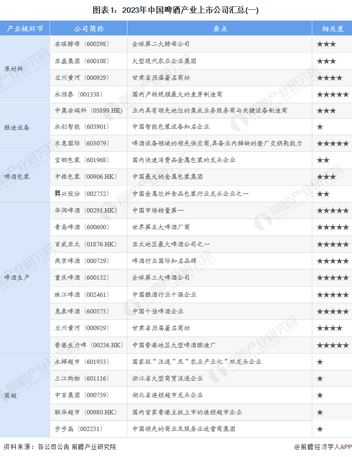 啤酒是我国酒精饮料行业重要组成部分,中国的啤酒生产量和销售量均领跑全球。目前,我国啤酒产业的上市公司数量较多,分布在各产业链环节。其中,涉及啤酒生产的上市公司包括:华润啤酒、百威亚太、青岛啤酒等等。