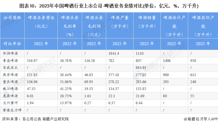 啤酒行业的上市公司中,百威亚太、华润啤酒以及青岛啤酒的营收规模位于中国啤酒市场的第一梯队,销售区域覆盖中国全域。从已有数据来看,青岛啤酒的啤酒业务占比最高,达98.53%。