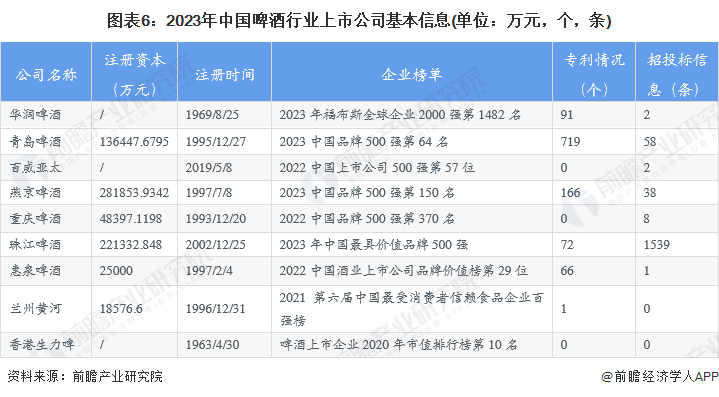 从啤酒行业的上市企业布局和已有信息分析,成立时间最早的企业为华润啤酒和香港生力啤,均成立于上个世纪60年代,专利信息最多的是青岛啤酒,招投标信息最多的则是珠江啤酒。