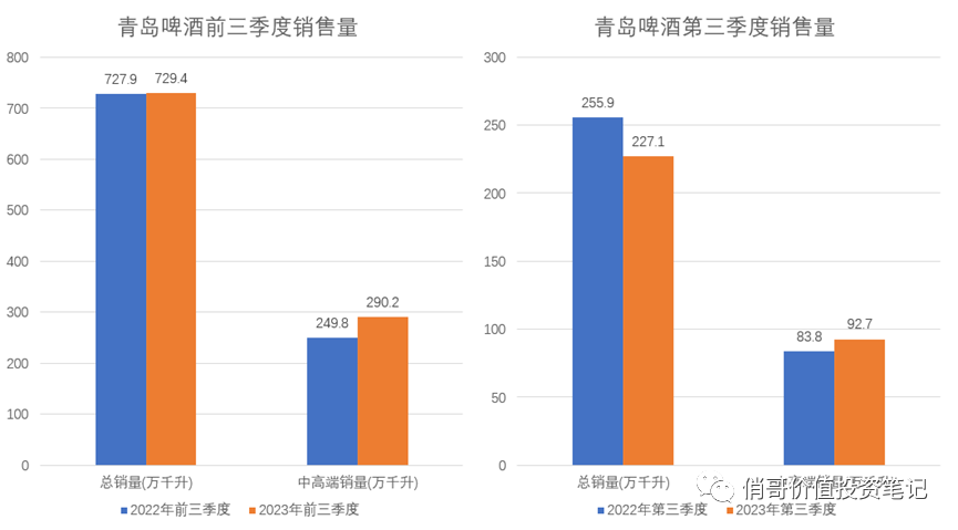 青岛啤酒2023年前三季度总销量729.4万千升,同比增长0.2%;中高端销量290.2万千升,同比增长16.17%(三季报披露的增长率是11%,应该是仅仅统计的第三季度的同比,而不是前三季度的同比)。其中第三季度总销量227.1万千升,同比下降11.25%;中高端销量92.7万千升,同比上升10.6%。