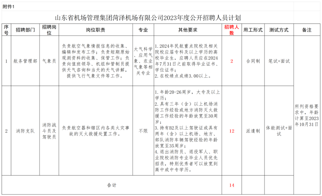具体招聘岗位及资格条件详见《山东省机场管理集团菏泽机场有限公司2023年度公开招聘人员计划》(附件1)。