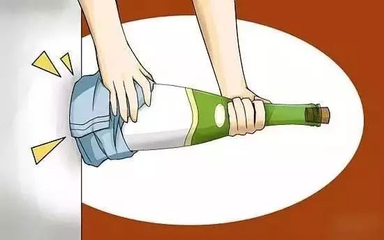 2、横着拿好酒瓶和缓冲物,找一面墙(如果是户外很可能是一棵树)用合适的力道有节奏的砸上去,如果没有这样的面,也可以把酒瓶倒着夹在自己的膝盖之间,找东西敲打酒瓶的底部。