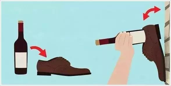 1、和毛巾法类似缓冲物换成了鞋子,把红酒瓶底垂直放入皮鞋后跟里面。