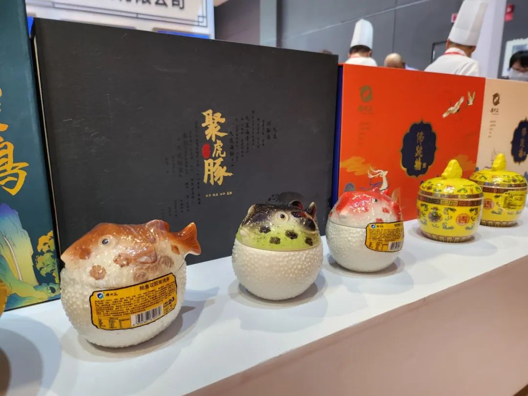 本次展会期间,天正展出了河豚鱼系列产品,其中重点亮相河豚鱼佛跳墙系-预制菜产品“聚虎豚”,该产品以大连地标产品“红鳍东方鲀”、“灰刺参”、“紫海胆”、“皱纹盘鲍”等经典海产品汇聚烹饪而成。