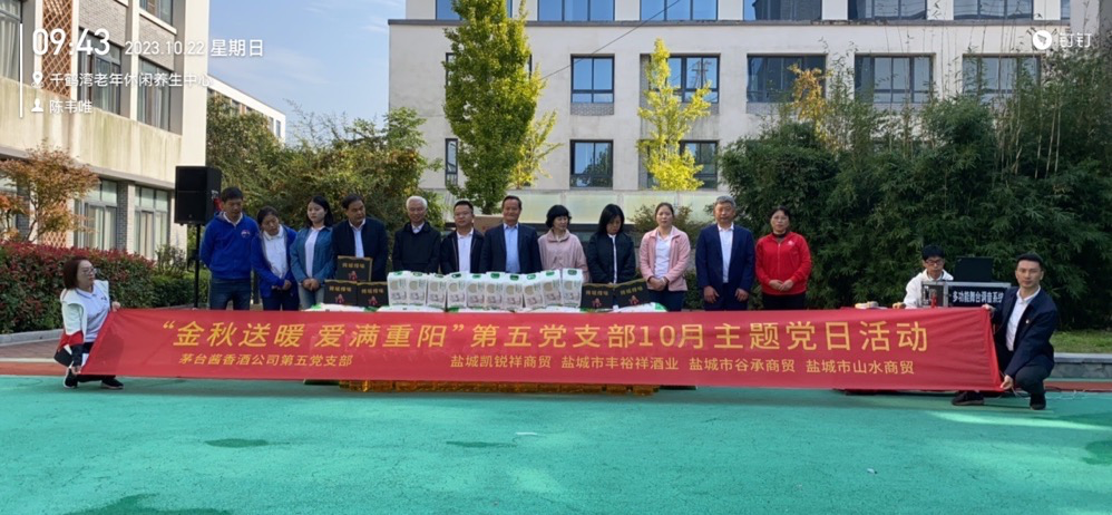 酱香酒公司第五党支部在今年重阳佳节携手盐城凯锐祥商贸、盐城市丰裕祥酒业、盐城市谷城商贸、盐城市山水商贸等经销商朋友们来到了江苏省盐城市千鹤湾敬老院,为院内400余名长者们送上了一份温馨的慰问。