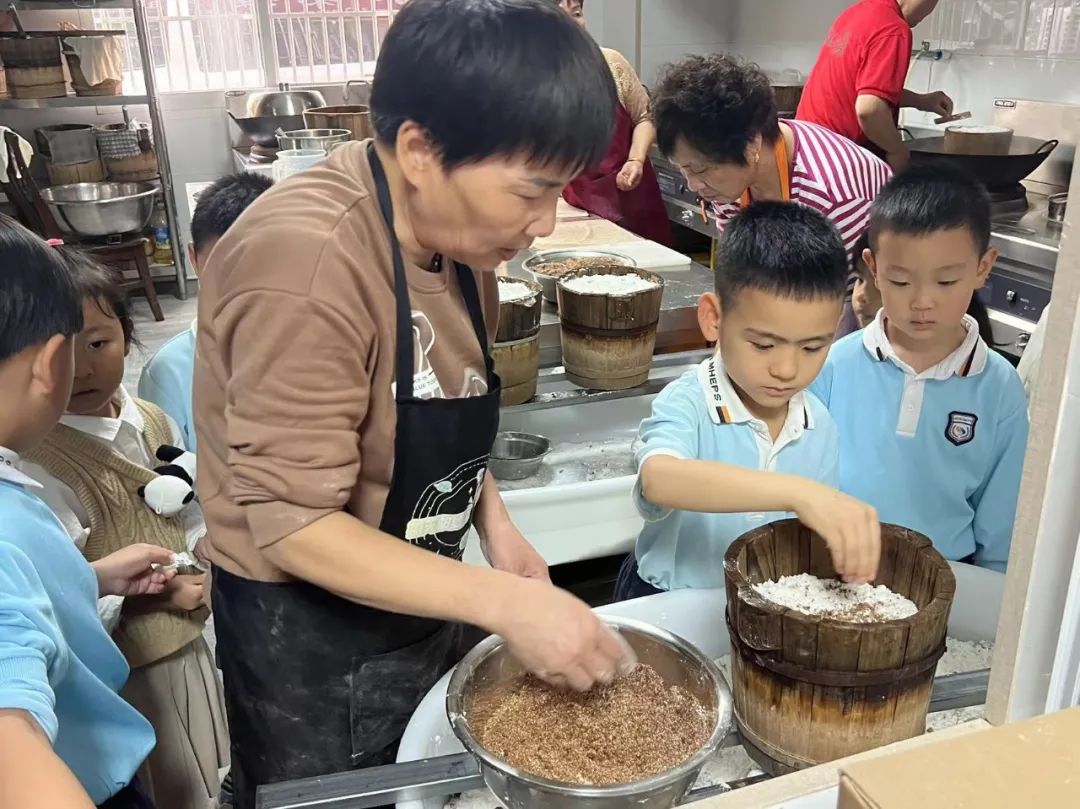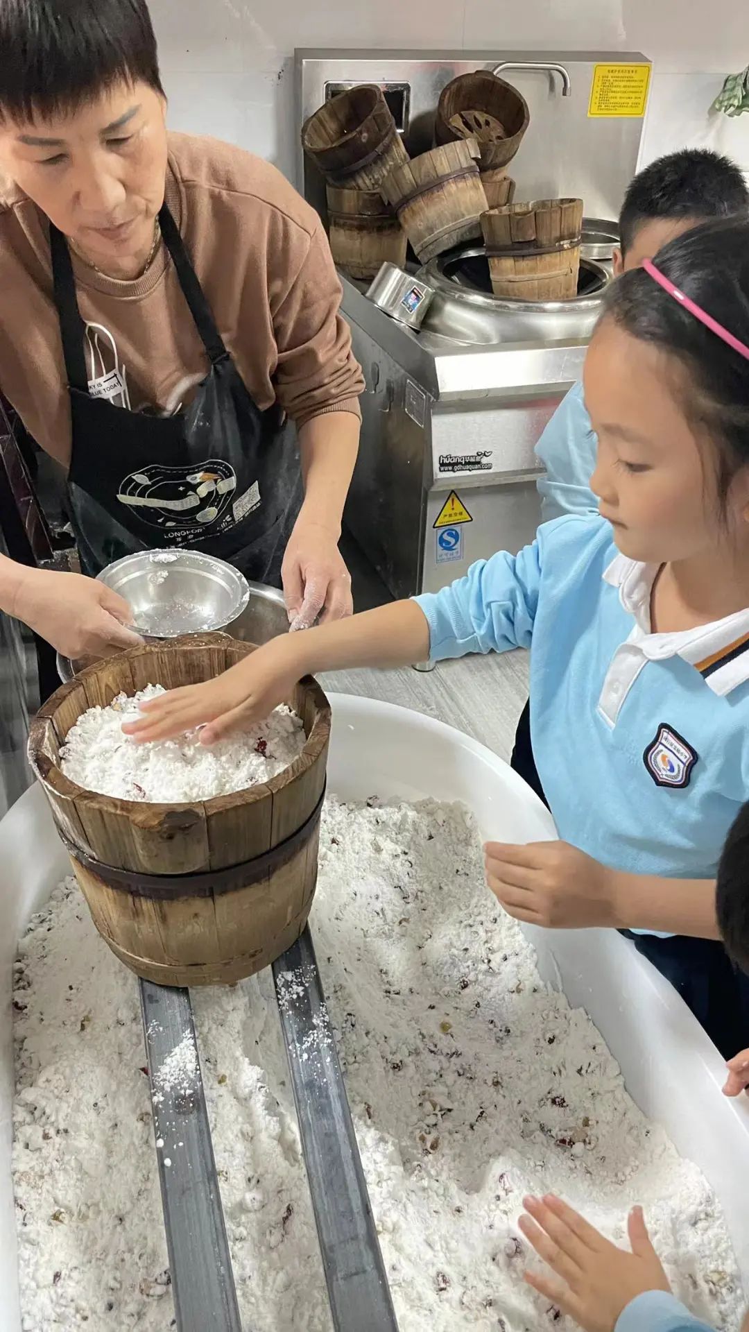 作为非物质文化遗产的传承,小可爱们一起来了解桶蒸糕的制作过程是一件非常有意义的事情。选米/红豆-泡米/红豆-磨粉/蒸豆-放入蒸桶进行蒸制,每一道工序都是人工操作,看似简单,但都很精细。