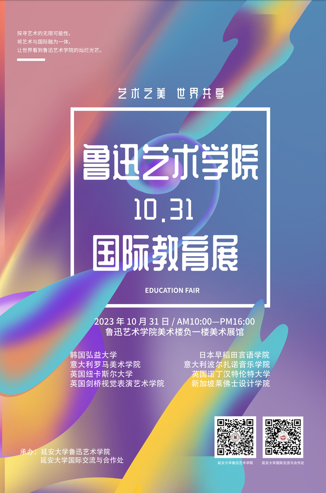 延安大学鲁迅艺术学院携手延安大学国际交流与合作处于10月31日共同举办国际教育展。国际教育展旨在为鲁迅艺术学院的学生提供宝贵的跨文化学习机会,培养综合素养,同时将优质海外院校的教育资源引进学院,建立一个海外院校与鲁迅艺术学院的交流、沟通平台。