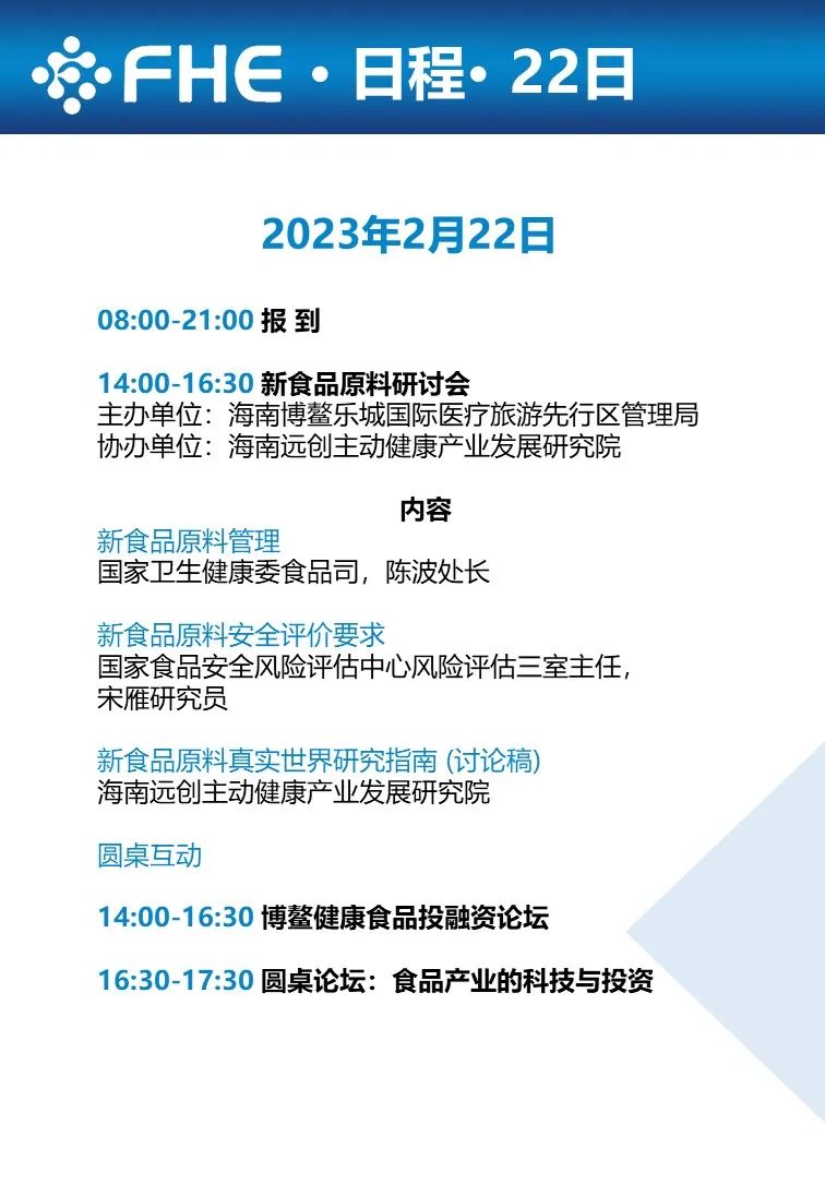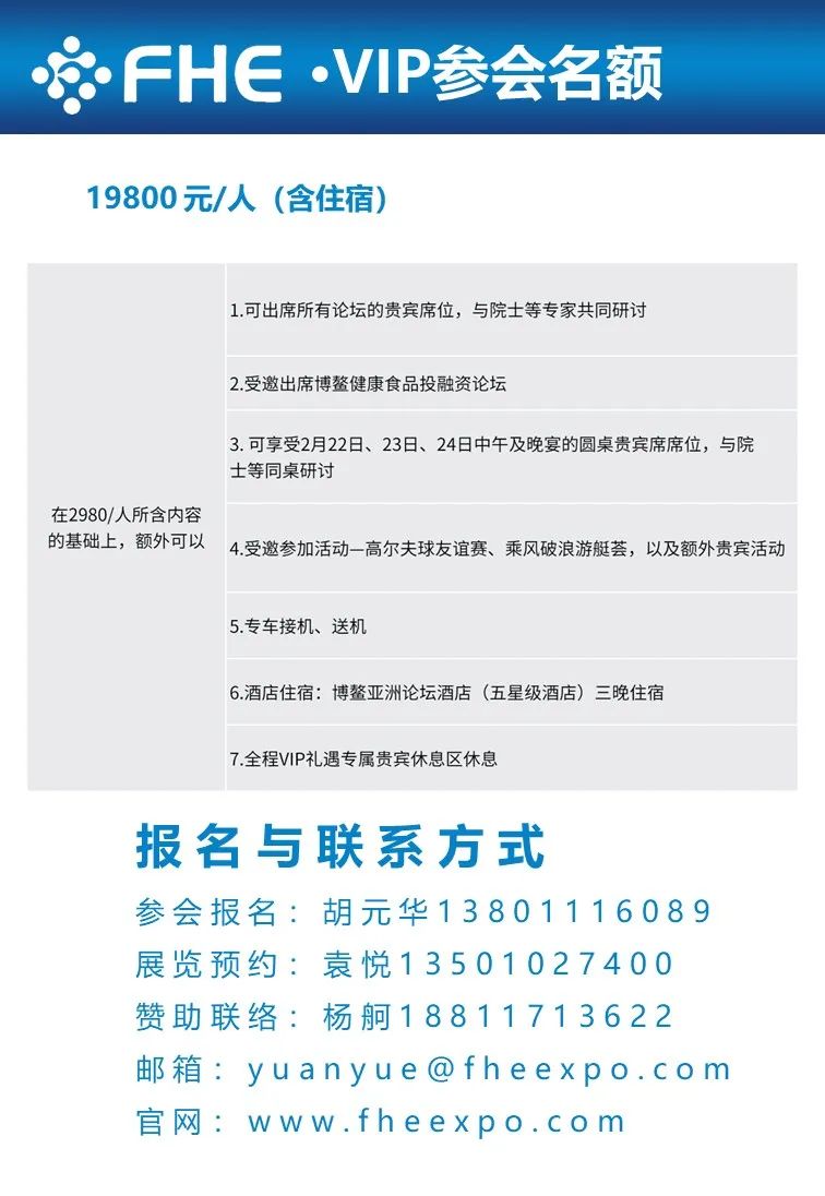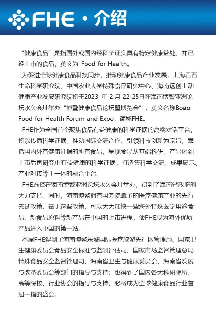2月22-25日,“博鳌健康食品论坛暨博览会”将于海南博鳌举办。中国工程院陈君石院士、 国际食品科学院罗云波院士牵头,联合国内 10 余位院士和权威专家,基于我国健康食品的发展现状,分析发展面临的薄弱环节, 以及对未来发展的趋势判断,围绕食品与健康的“科技创新与循证证据” ,打造多方位平台。