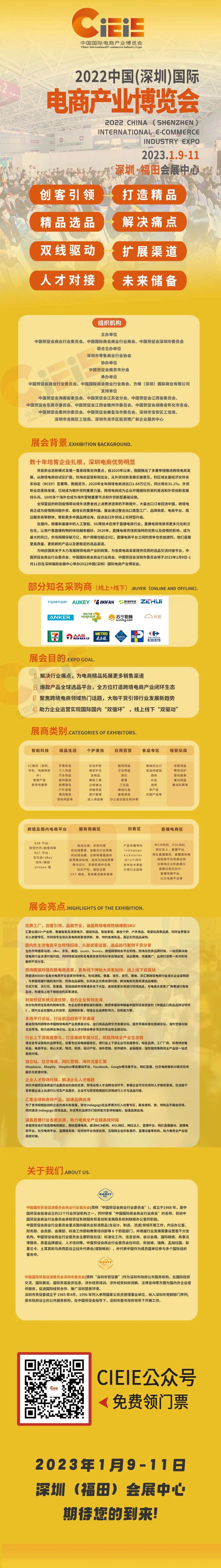由中国贸促会商业行业委员会、中国国际商会商业行业商会、中国贸促会深圳市委员会联合深圳市零售商业行业协会举办的中国(深圳)国际电商产业博览会,将于2023年1月9日-11日在深圳会展中心(福田)举办!