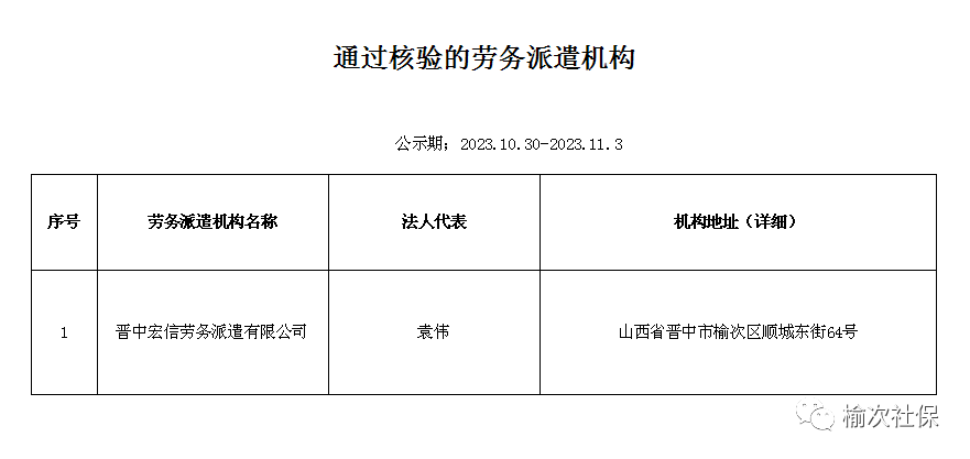 根据《关于做好2022年度劳务派遣核验工作的通知》(市人社办函〔2023〕25号)文件要求,榆次区人社局对晋中宏信劳务派遣有限公司进行2022年度劳务派遣补验工作。经审核,已通过核验。现将核验情况进行公示。