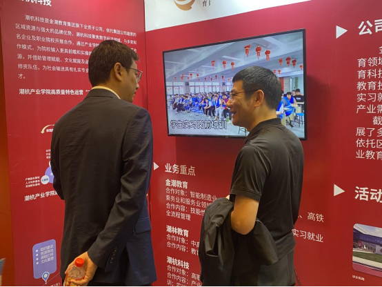 本次展会上,作为集团业务“新生代”,潮杭科技闪亮登场。副总裁汤浩竹表示,潮杭科技依托杭州前沿领先产业,聚焦数字经济领域,联手淘宝、银泰等多家行业龙头公司,与职业院校共建产业学院。在实施阶段,潮杭科技凭借一套产业学院高质量特色运营“三三三”模式和“四步走”策略,既高举高打,又很“接地气”。通过这种模式,不仅为院校输入更具前瞻和实操的课程资源、双师资源和项目资源,还会借助管理赋能、文化赋能及品牌赋能,助力学校打造一流的学科专业和师资队伍,为社会输送具有扎实专业技能和良好职业素养的高质量人才。
