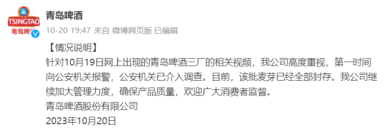 青岛啤酒、警方和市场监督管理局三方的完整调查公告也并没有通报,而与之对应的10月19日在抖音上第一个流出的视频与10月20日媒体报道的第一个视频,目前已经全被删除。