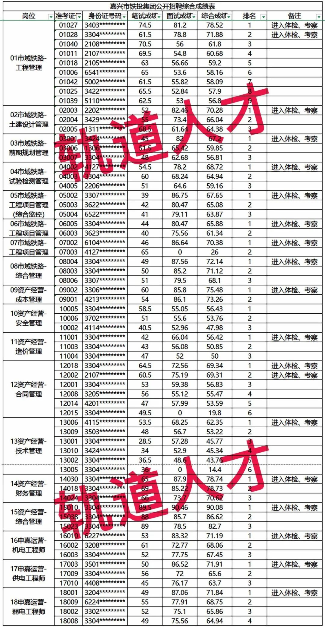 1、嘉兴市铁路与轨道交通投资集团有限责任公司公开招聘综合成绩及入围体检考察人员公示