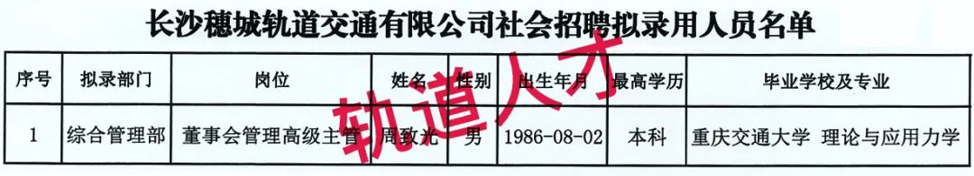5、长沙穗城轨道交通有限公司社会招聘拟录用人员公示