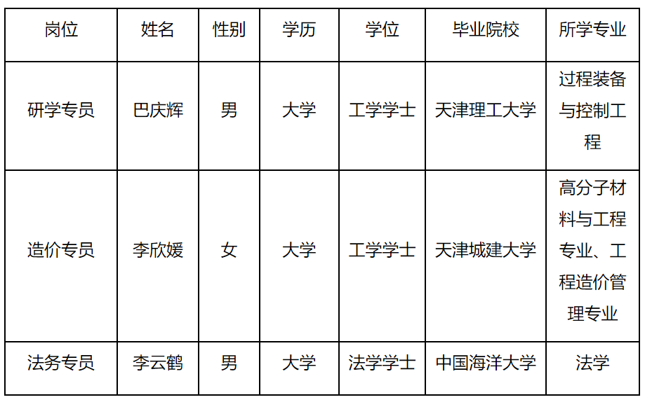为加强招聘工作的社会监督,现将天津轨道交通城市发展有限公司拟录用人员予以公示。公示时间:2023年10月30日至2023年11月3日。应聘者或者其他人员如对公示信息有异议,可在公示期内举报或反映。举报或反映务必客 观真实。联系人(纪检室):刘远涛 联系电话:022-58951405 联系人(综合部):郭森 联系电话:022-58956785 邮箱:tbhzhb@126.com 联系地址:天津市和平区世纪都会写字楼27层 拟录用人员基本情况: