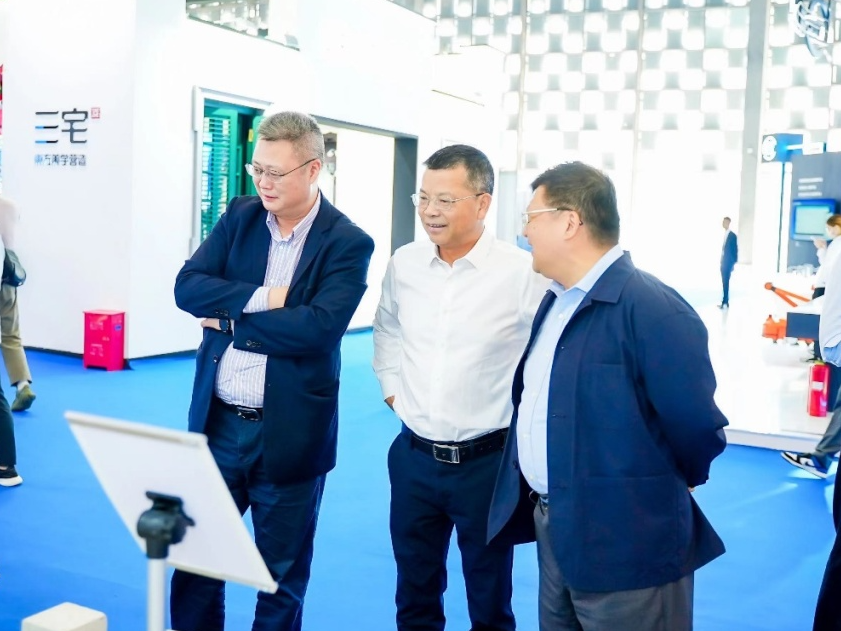 何锡兴在集团企业展台交流服务重大建设工程和支撑绿色低碳建筑发展方面的工作成果。