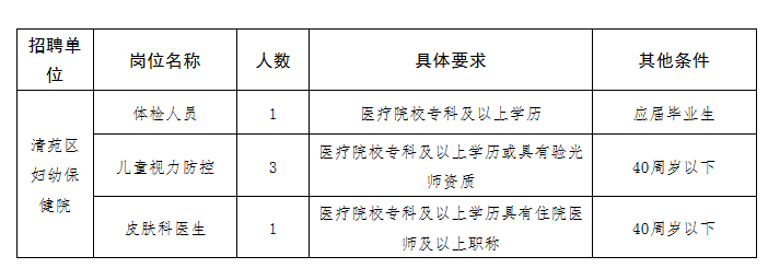 聘用专业技术工作人员5名(体检人员1名,儿童视力防控3名,皮肤科医生1名,具体要求见附件),实行分岗位报名,统一面试,分岗位排名。招聘工作委托保定市瑾汇人力资源服务有限公司实施,按照发布公告、组织报名、资格审查、面试、体检、审查、公示等程序进行