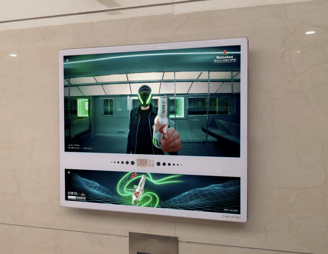 此次创意包梯广告同样根植于“喜力®星电音”IP,探索用独具新意和惊喜感的创意撬动年轻人注意力。喜力将“狂欢派对专列”的概念从TVC延伸至实体空间。电梯门为列车门,沿用喜力星银产品的银色元素,梯内空间为车厢,以银色与绿色为主色调,整体融合金属与镜面元素,呈现出饱含金属质感的赛博朋克风格。