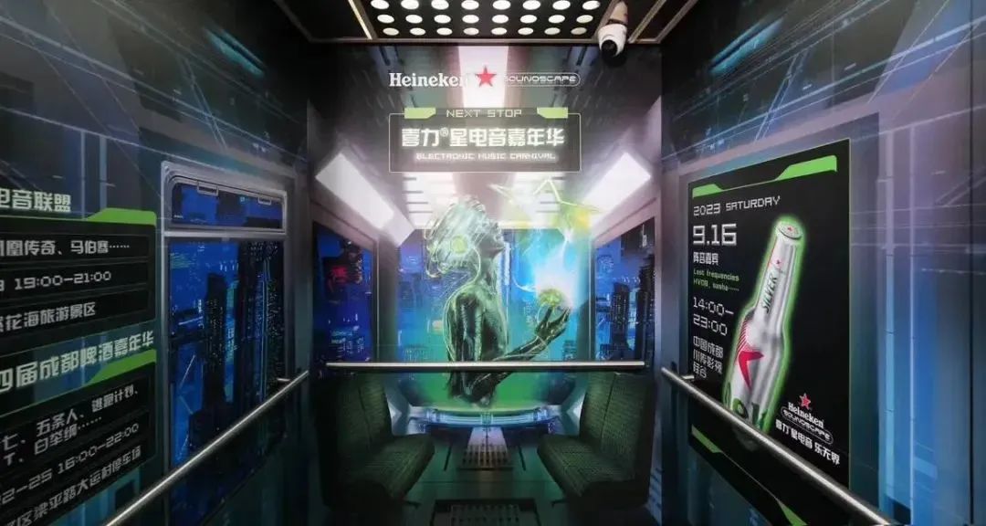近日,伴随着《星电音联盟》的收官以及星电音嘉年华活动进入预热阶段,喜力更是携手分众创新性地推出创意包梯广告,在电梯中打造“星电音派对专列”,配合电视广告、框架广告的日常规模化传播,利用分众电梯媒体的场景营销价值,完成品牌势能和品牌情绪价值的一次集中引爆,贡献场景体验式营销新的经典案例。