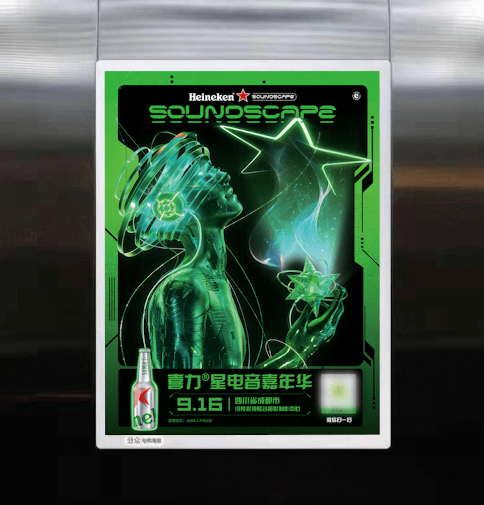 借势节目热度,喜力在线上线下火力全开,以电音为支点,线下分众电梯媒体为重要传播平台,围绕超级IP“喜力®星电音”持续探索新玩法,将IP渗透到年轻人生活场景,加深品牌与电音文化的绑定,传播年轻潮流的先锋品牌形象。