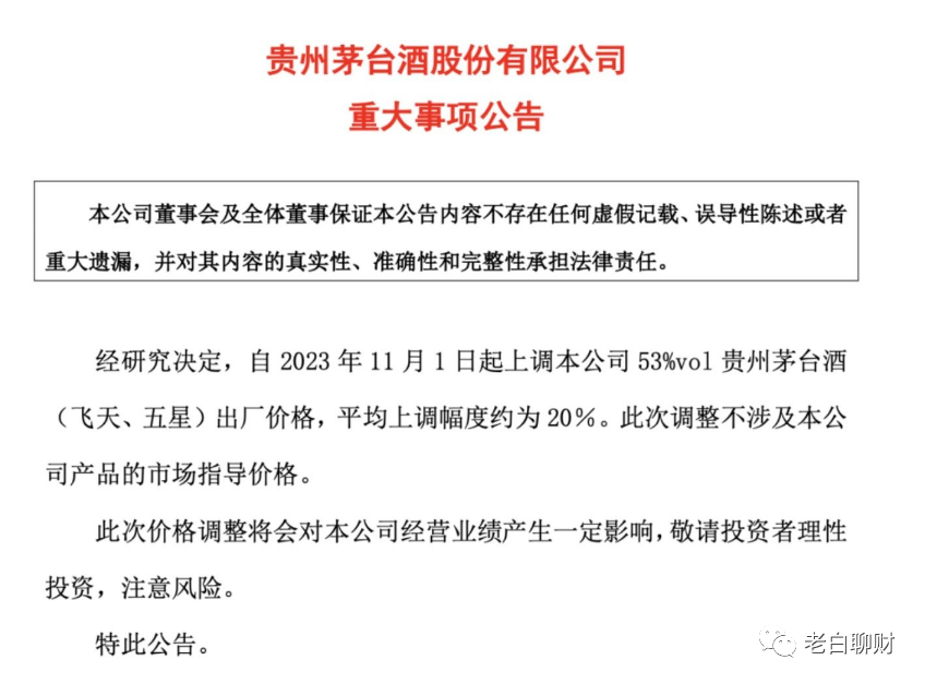 10月31日深夜,贵州茅台发布重大事项公告称,经研究决定,自2023年11月1日起上调本公司53%vol贵州茅台酒(飞天、五星)出厂价格,平均上调幅度约为20%。此次调整不涉及本公司产品的市场指导价格。贵州茅台在公告中提示,此次价格调整将会对本公司经营业绩产生一定影响,敬请投资者理性投资,注意风险。