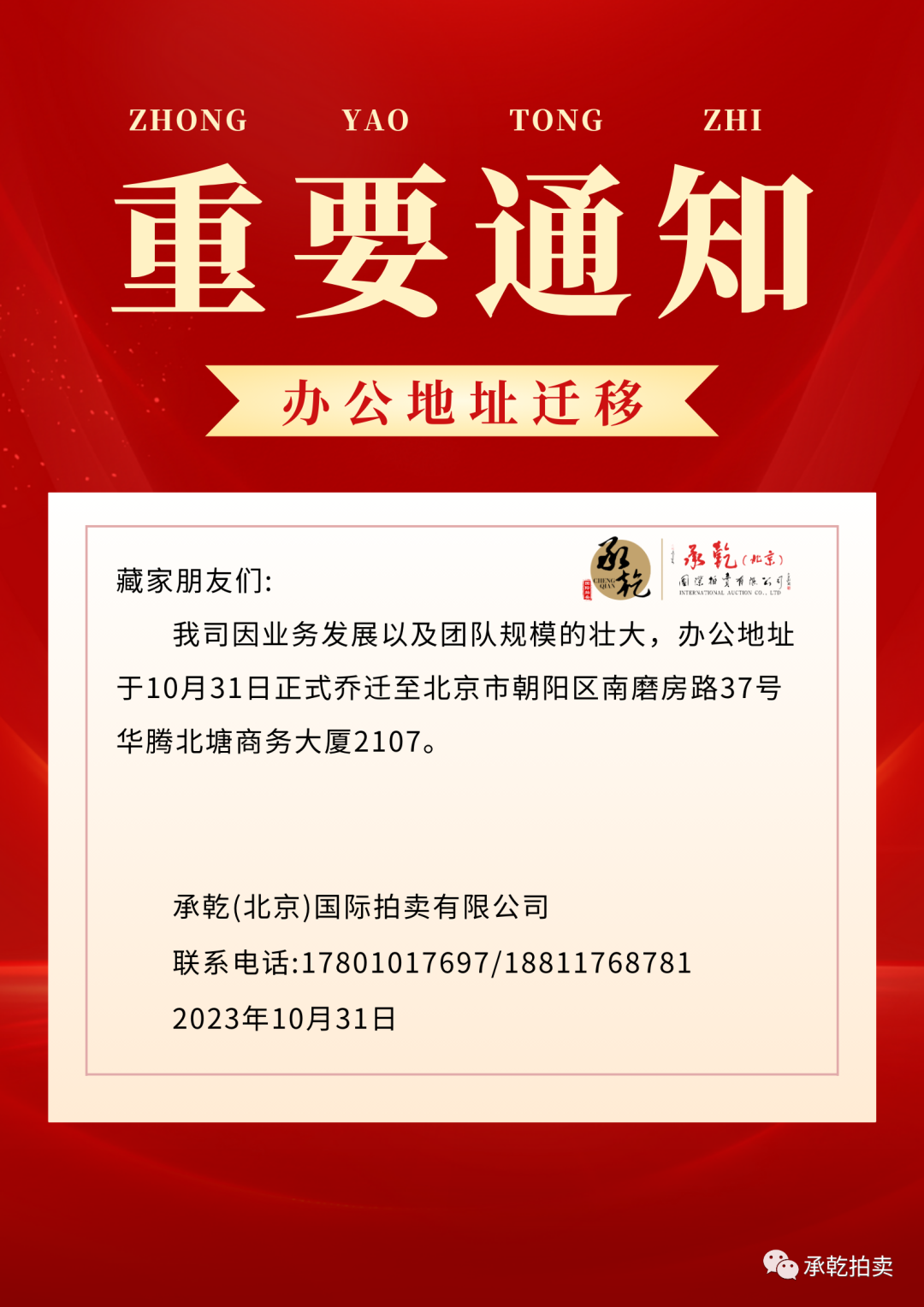 随着公司业务发展以及团队规模的壮大,承乾(北京)国际拍卖有限公司办公地址于10月31日正式乔迁至北京市朝阳区南磨房路37号华腾北搪商务大厦2107啦!
