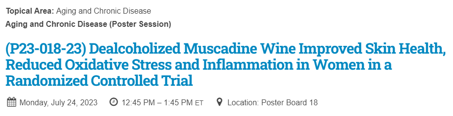 2023年7月24日,美国佛罗里达大学的研究人员在波士顿举行的美国营养学会年会《NUTRITION 2023》上发表了一项题为" Dealcoholized Muscadine Wine Improved Skin Health,Reduced Oxidative Stress and Inflammation in Women in a Randomized Controlled Trial "交叉研究。