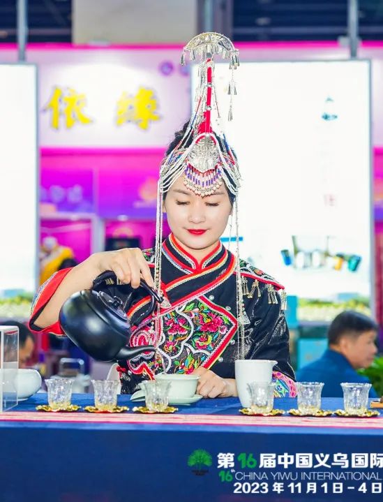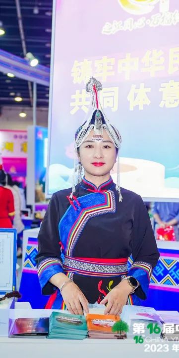 穿着民族服饰的畲乡姑娘也成为展会一景,吸引游客合影。
