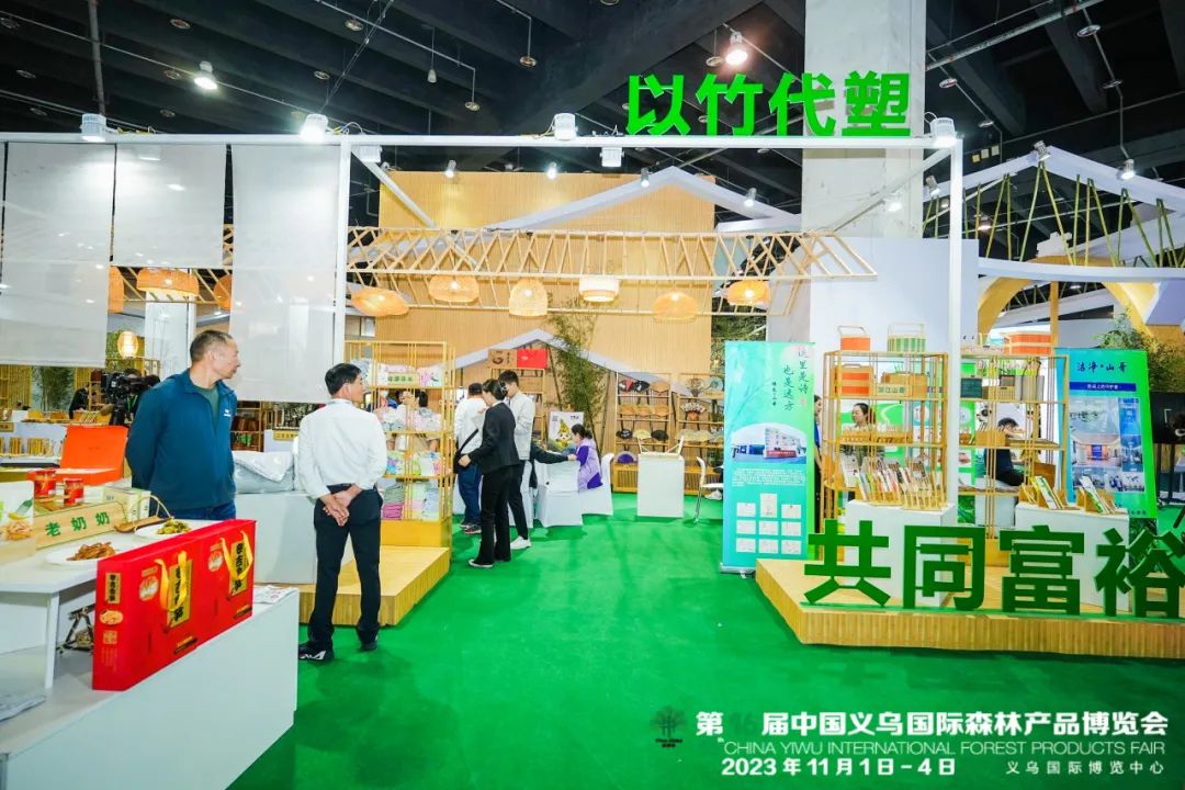 “以竹代塑”竹产品展览专区系本届义乌森博会为贯彻我国同国际竹藤组织共同发起的“以竹代塑”全球发展倡议,首次特设的展区,组织以重组竹、竹基复合材料、竹制餐具等为重点的特色竹产品展销,推动开发创新竹制品替代塑料制品,减少塑料污染。