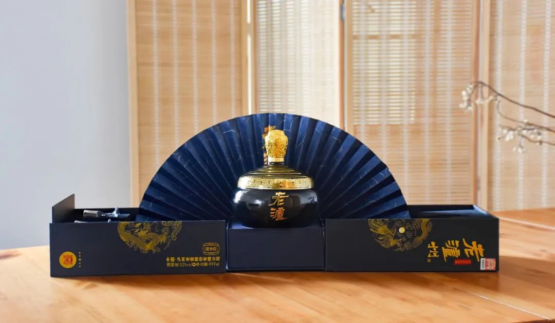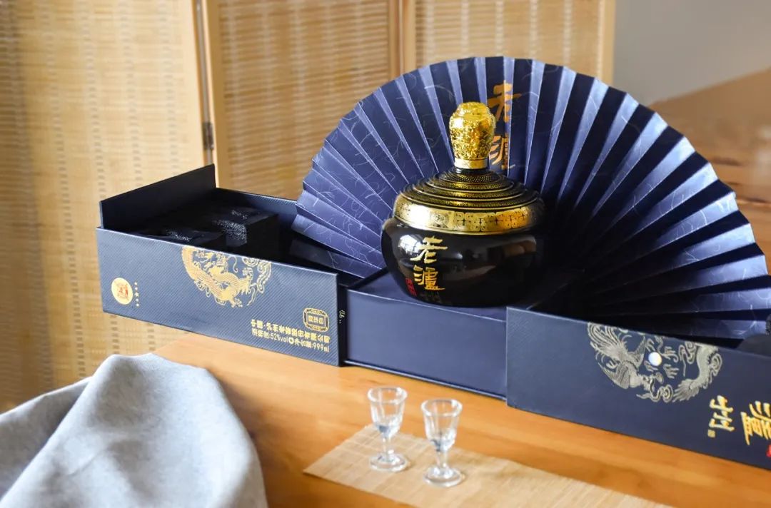 一瓶足足999ml的大坛设计,靛蓝色礼盒包装。打开后,一把精美的扇子前,金蓝相衬的酒瓶带着岁月的沉淀而来。