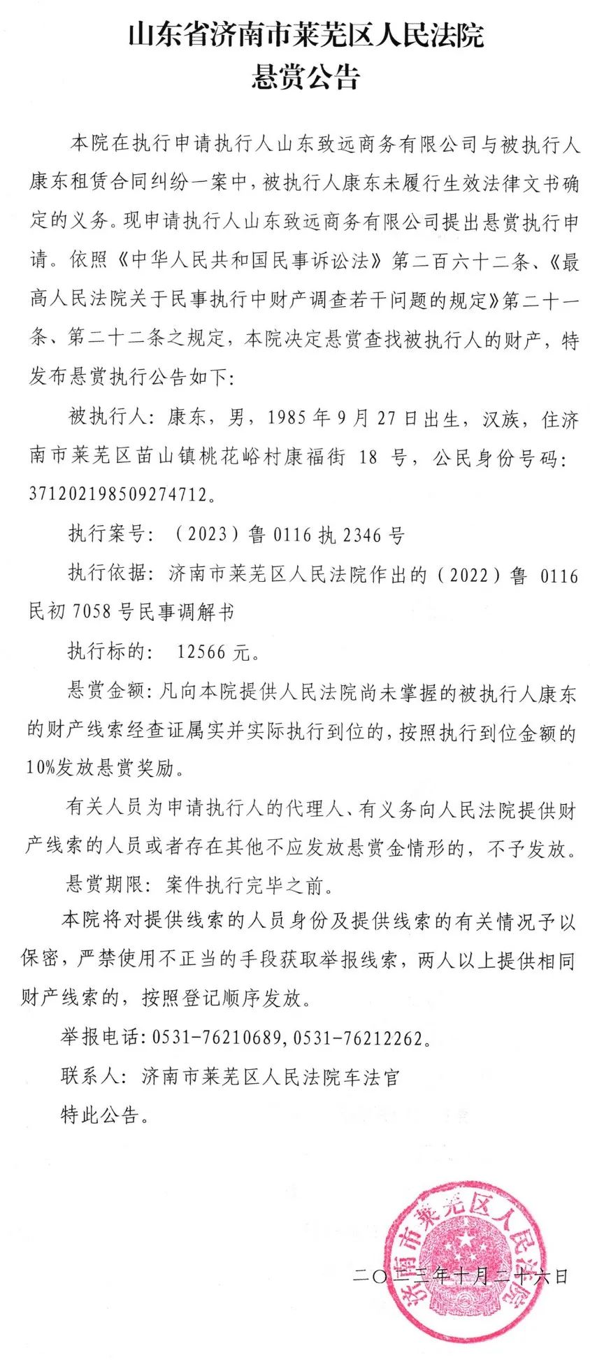 本院在执行申请执行人山东致远商务有限公司与被执行人康东租赁合同纠纷一案中,被执行人康东未履行生效法律文书确定的义务。现申请执行人山东致远商务有限公司提出悬赏执行申请。依照《中华人民共和国民事诉讼法》第二百六十二条、《最高人民法院关于民事执行中财产调查若干问题的规定》第二十一条、第二十二条之规定,本院决定悬赏查找被执行人的财产,特发布悬赏执行公告如下: