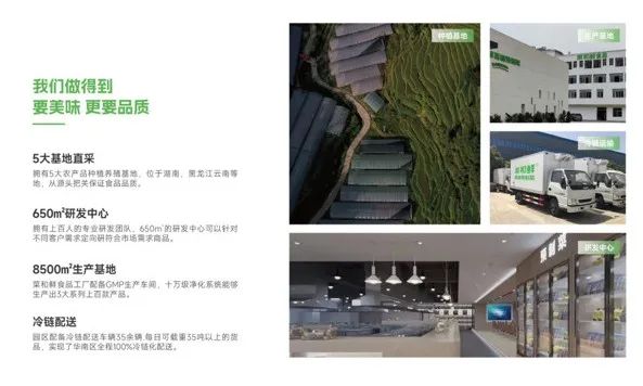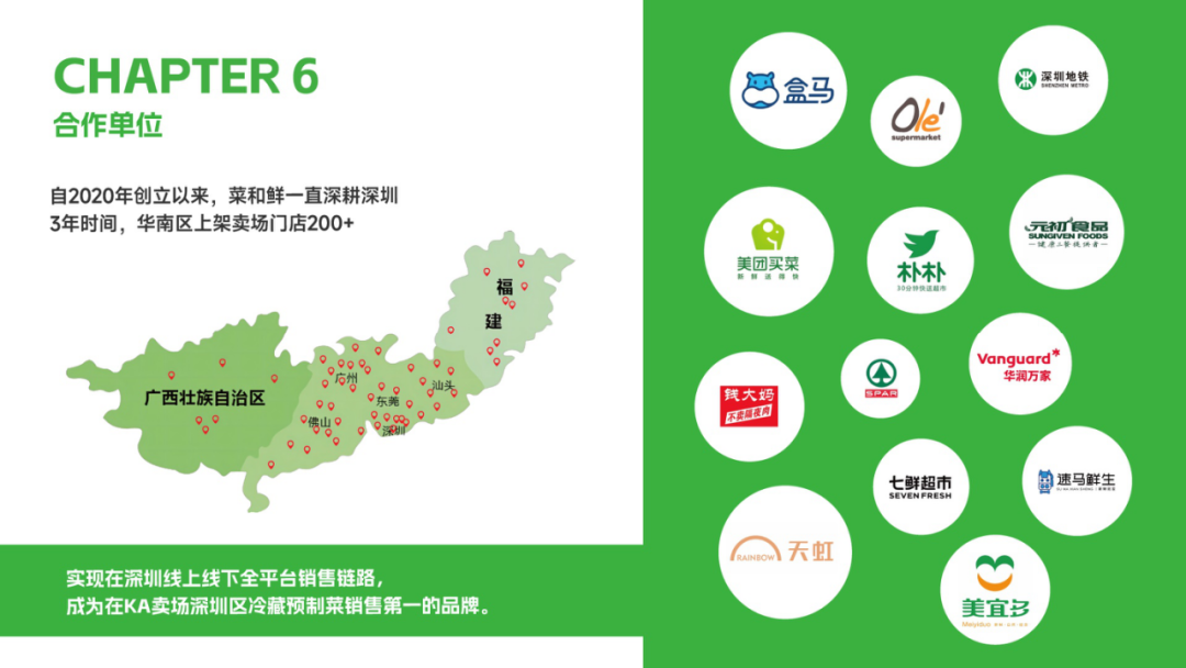 目前菜和鲜产品已经入驻盒马,天虹,华润万家,OLE,朴朴,元初,美团买菜等大型的KA渠道。