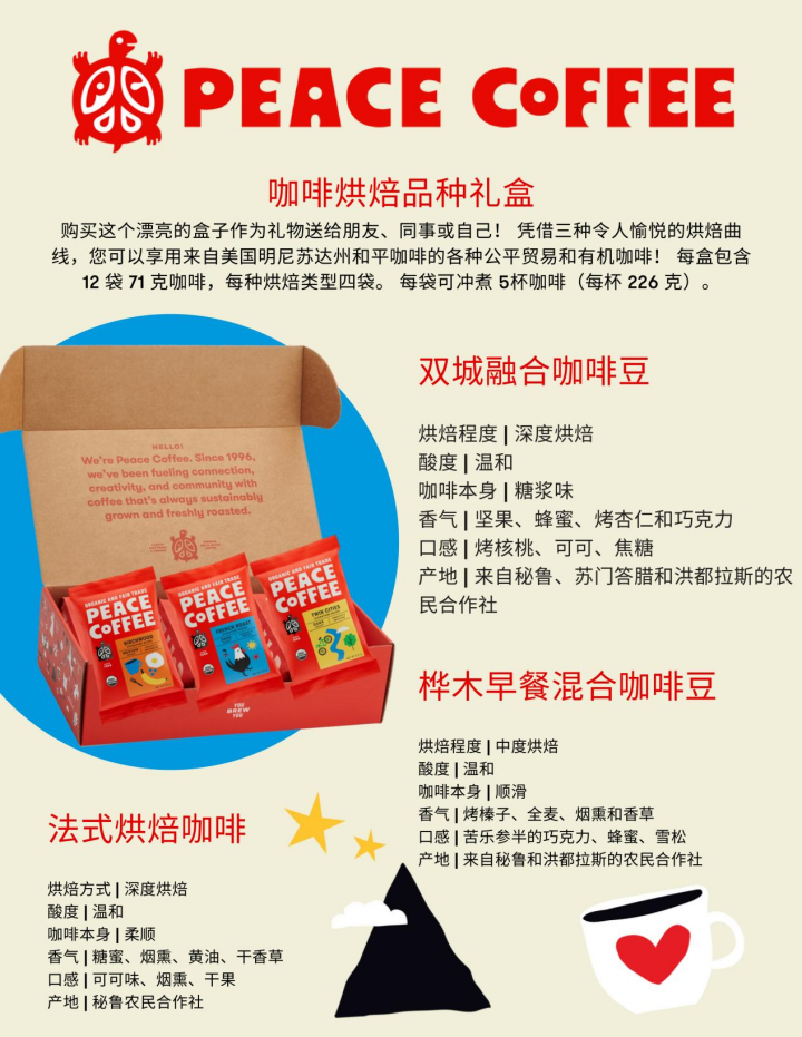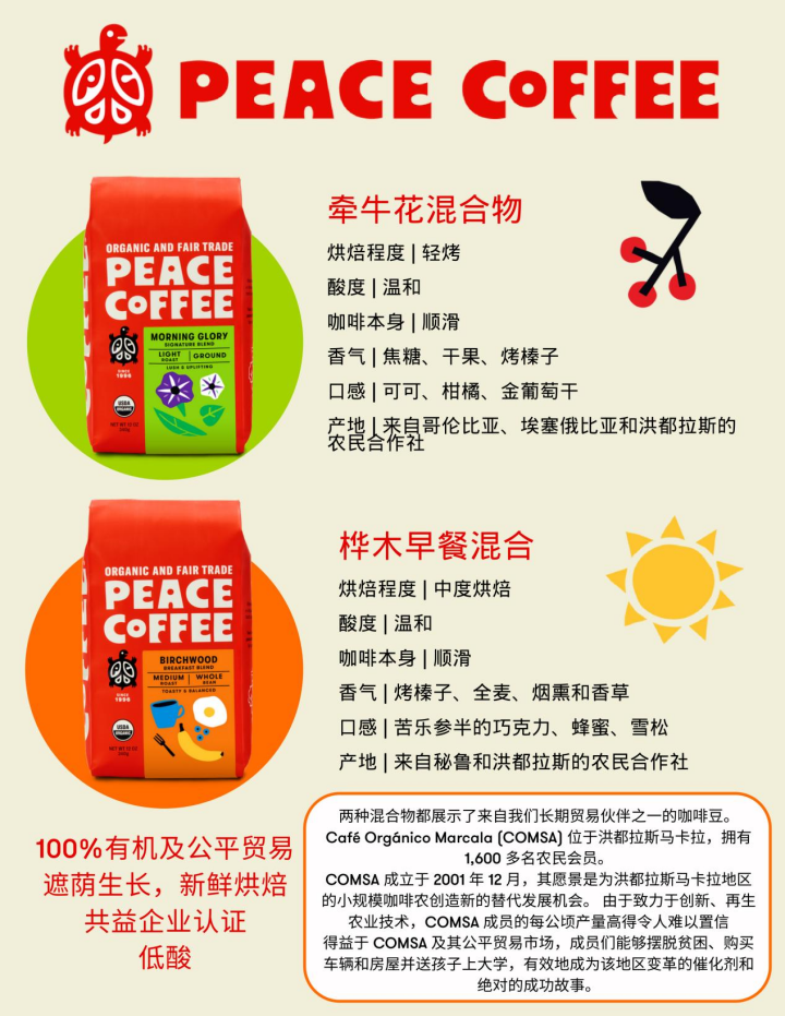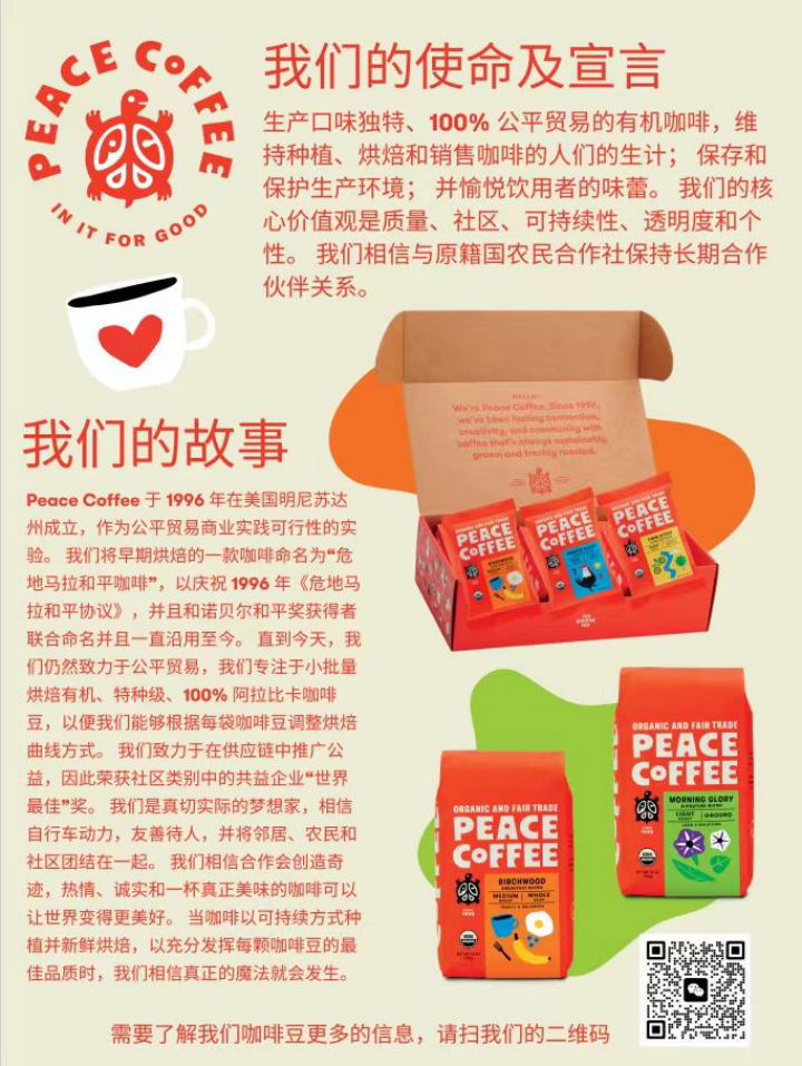 园洋国际贸易有限公司的“和平咖啡”品牌于1996年在美国明尼苏达州成立。该品牌将早期烘焙的一款咖啡命名“危地马拉和平咖啡”,是与诺贝尔和平奖获得者联合命名的,目的是庆祝1996年危地马拉和平协议。园洋国际贸易有限公司专注于小批量烘焙咖啡豆,目的是能够根据每袋咖啡豆品质及时调整烘焙曲线,以便实现每袋咖啡豆保持最佳口感。