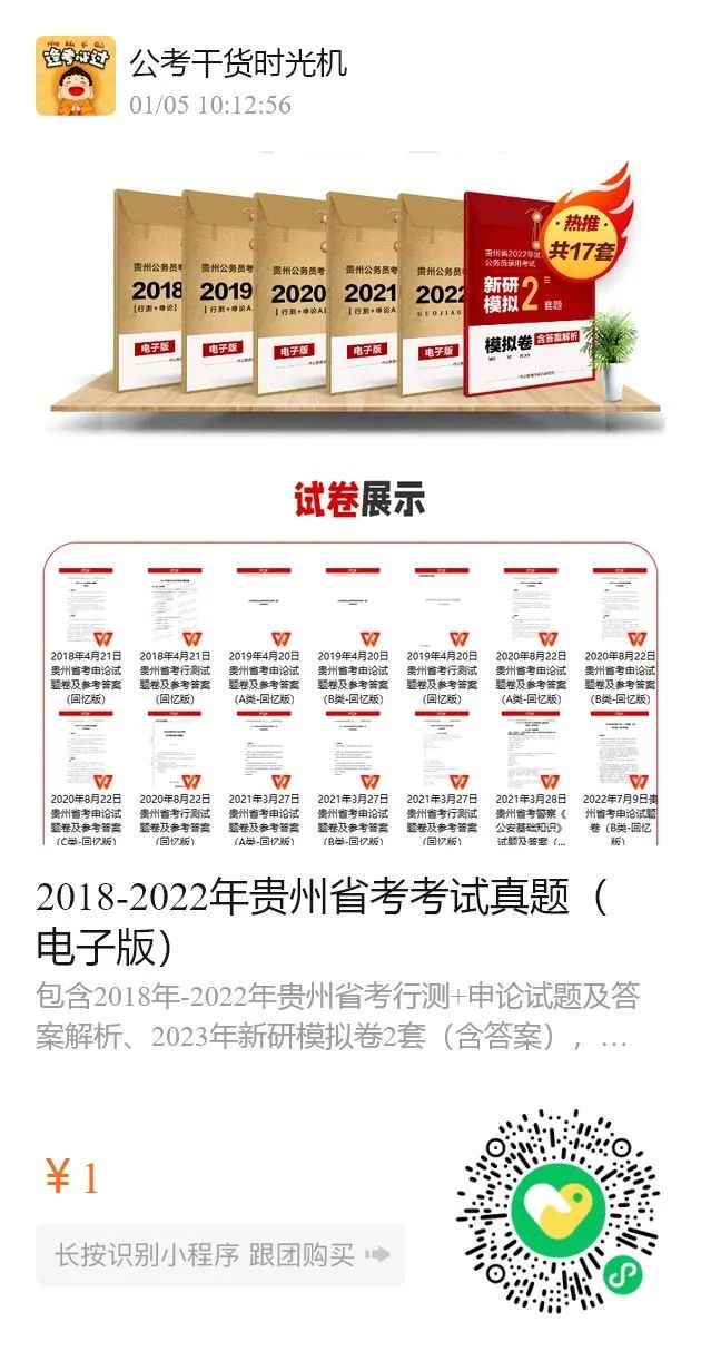 没有复习资料?不知道如何复习?不用担心!《2023贵州公务员考试-近5年省考试题》帮你解决困扰,帮助考生了解往年考试题型、出题方向、把握考点,从往年试题训练练抓出自身弱项;帮助考生梳理重难点!点击下方卡片领取!