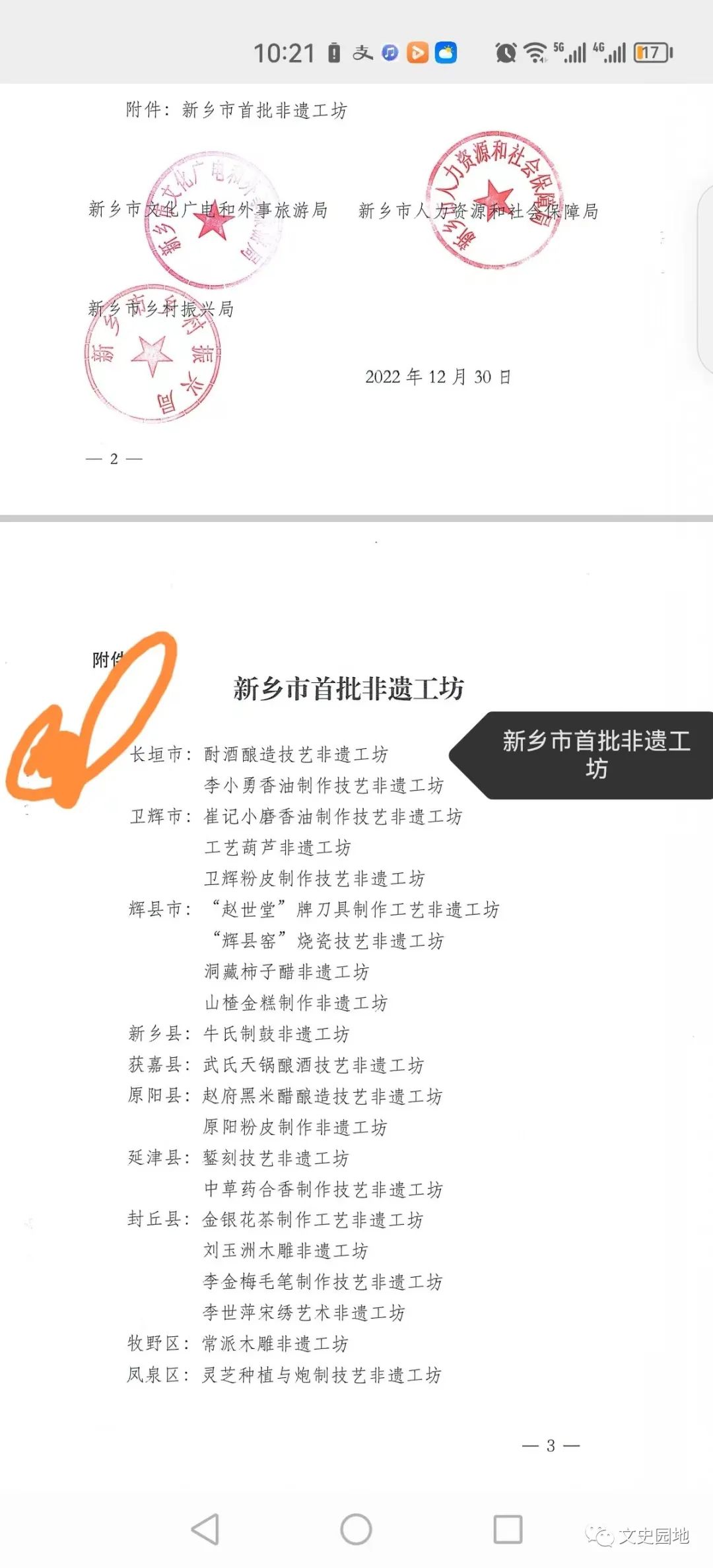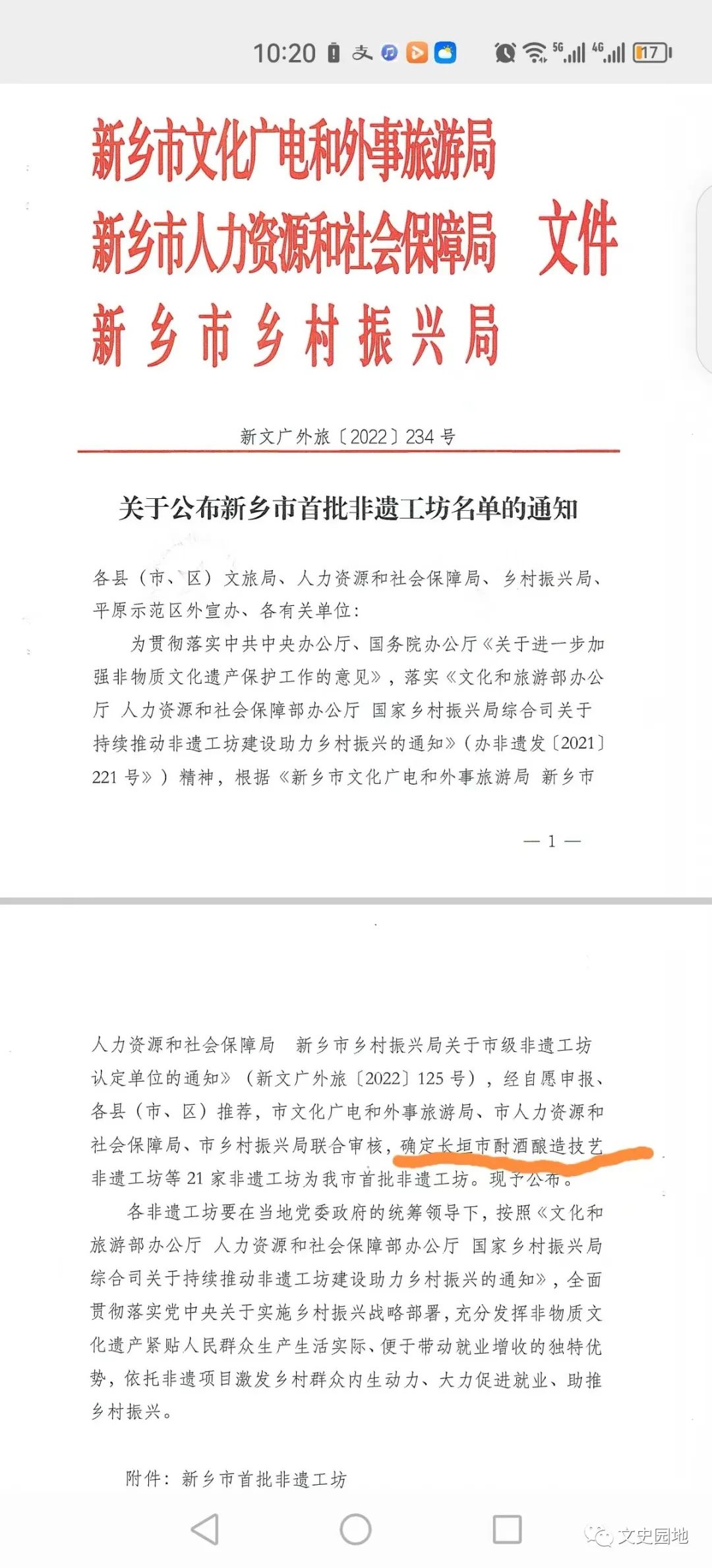 经新乡市文化广电和外事旅游局、新乡市人力资源和社会保障局、新乡市乡村振兴局联合审核,认定长垣市酎酒酿造技艺非遗工坊为新乡市首批非遗工坊。