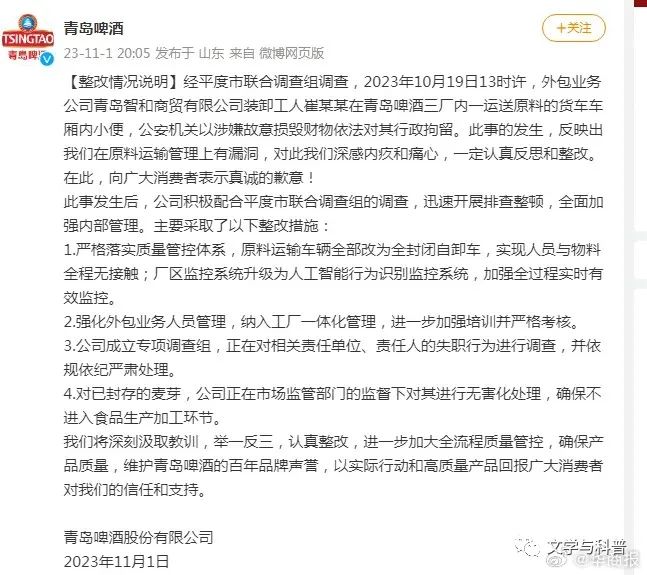 对此,#青岛啤酒发布整改说明并道歉# :深感内疚和痛心,一定认真反思和整改。此事发生后,公司积极配合平度市联合调查组的调查,迅速开展排查整顿,全面加强内部管理。主要采取了以下整改措施: